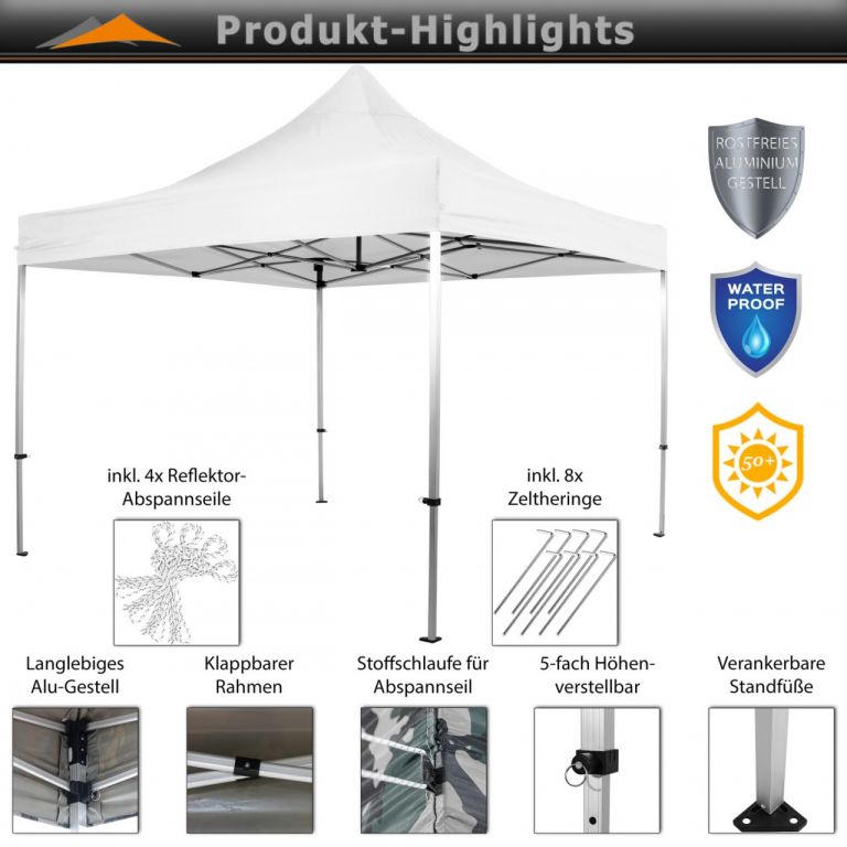 Namiot składany jest wysokiej jakości. Namiot jest w 100% funkcjonalny - jest wodoodporny, a dzięki specjalnie impregnowanemu poszyciu blokuje do 98% promieni słonecznych UV. Rama ze stali nierdzewnej zapewnia ochronę przed zarysowaniami i korozją. Dla większej stabilności produkt posiada powiększone konstrukcjne nógi, ekstrastabilny materiał łączący i wysokiej jakości system zatrzaskowy z blokowaniem śrubą zewnętrzną. Dach ma centralny słupek napinająca.