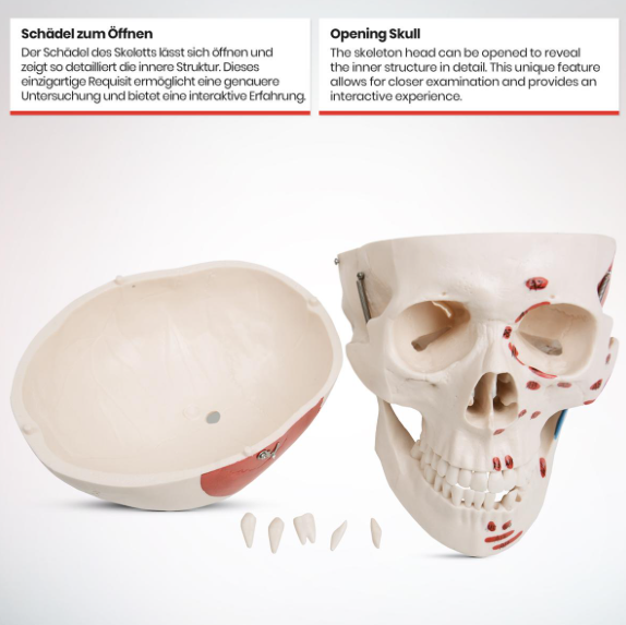 Model wykonany z trwałego PVC, łatwy do czyszczenia i odporny na uszkodzenia. Ruchome kończyny, zdejmowana czaszka, szczęka i zęby umożliwiają praktyczną manipulację. Stabilny stojak na kółkach zapewnia łatwe przemieszczanie. Montaż jest prosty i zajmuje tylko kilka minut.