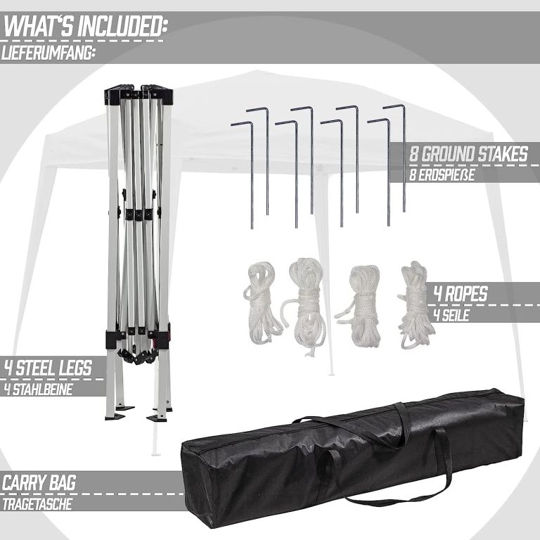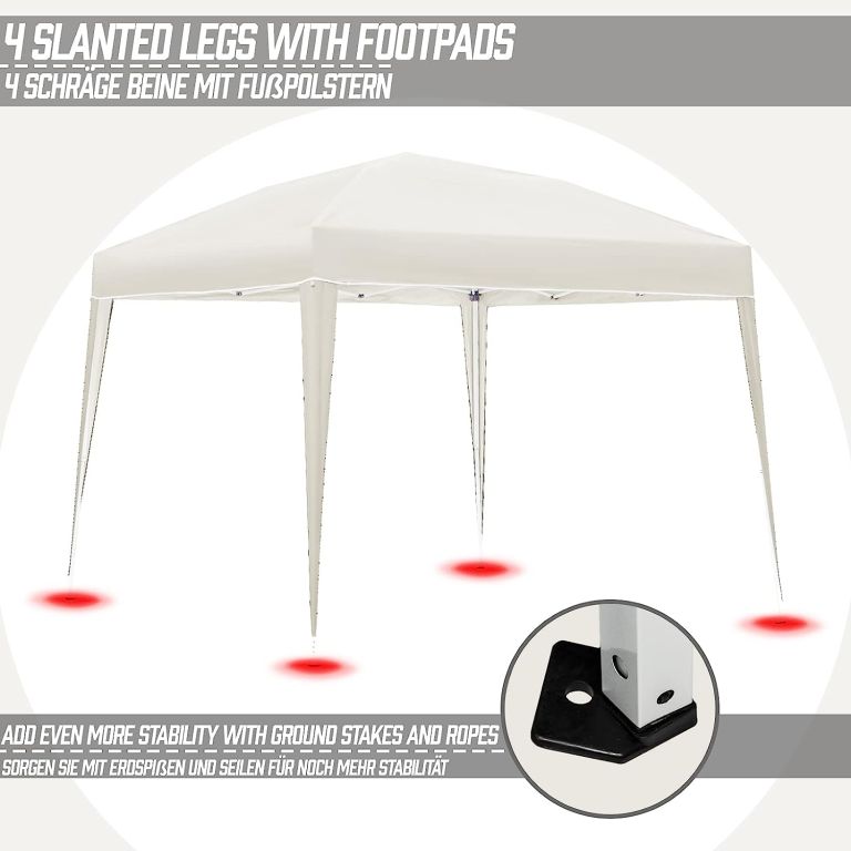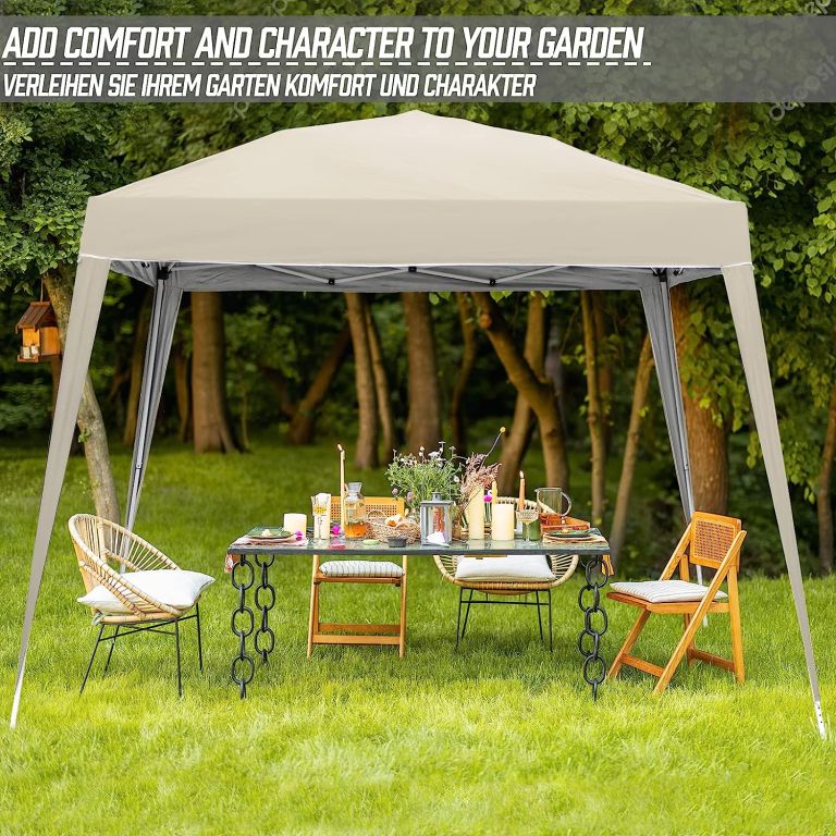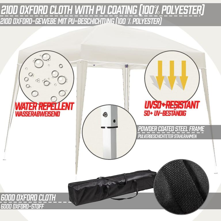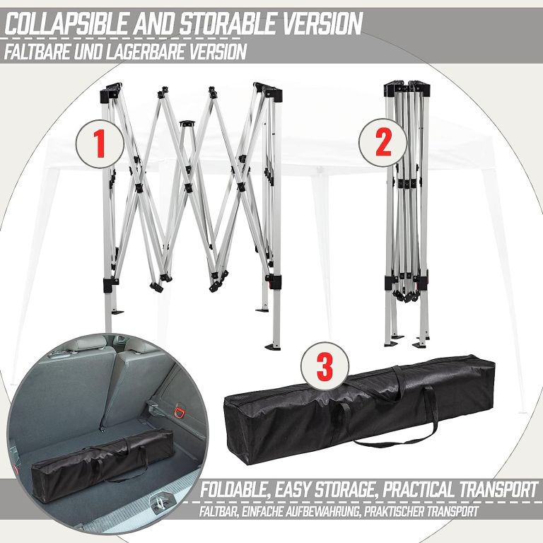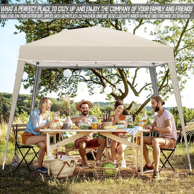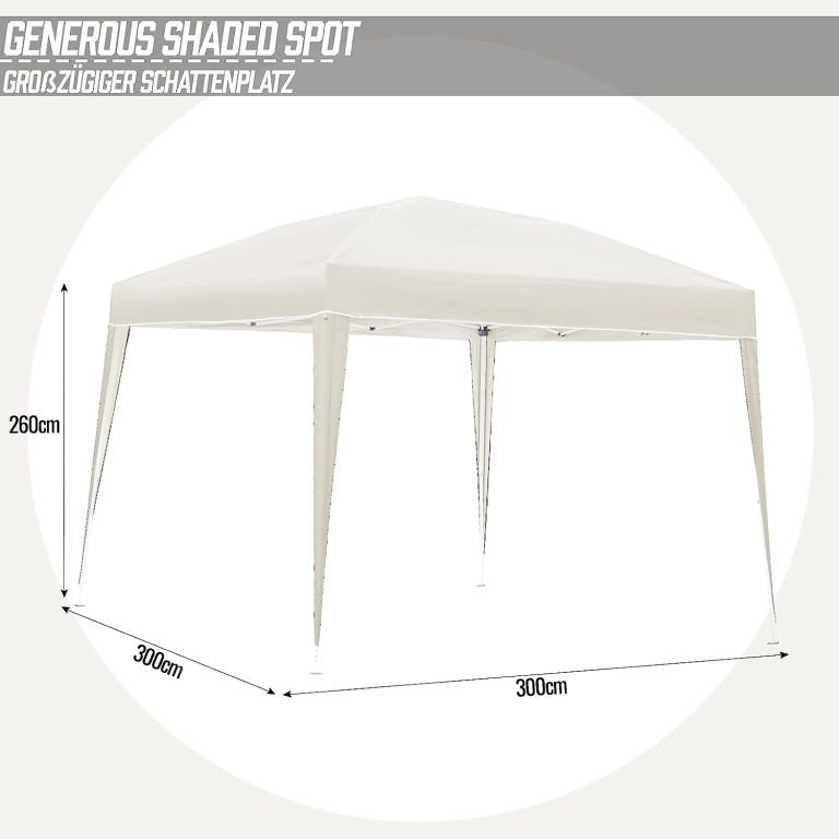 Zorganizuj przyjęcie w ogrodzie lub spotkanie z przyjaciółmi w cieniu tego stylowego namiotu. Klasyczny design i neutralne kolory doskonale wpasują się w każde otoczenie i zwiększą estetykę Twojego domu i ogrodu. Dobrze zaprojektowana solidna stalowa rama i składana konstrukcja oferuje wysoki poziom funkcjonalności, trwałości i stabilności. Namiot imprezowy jest dostarczany w komplecie z czterema nogami, czterema linami i ośmioma palikami do ziemi (dla bezpiecznego ustawienia), a także torbą do przenoszenia dla łatwego transportu i praktycznego przechowywania.