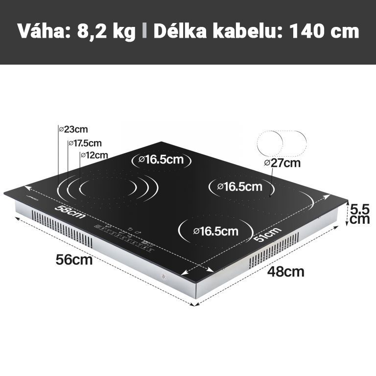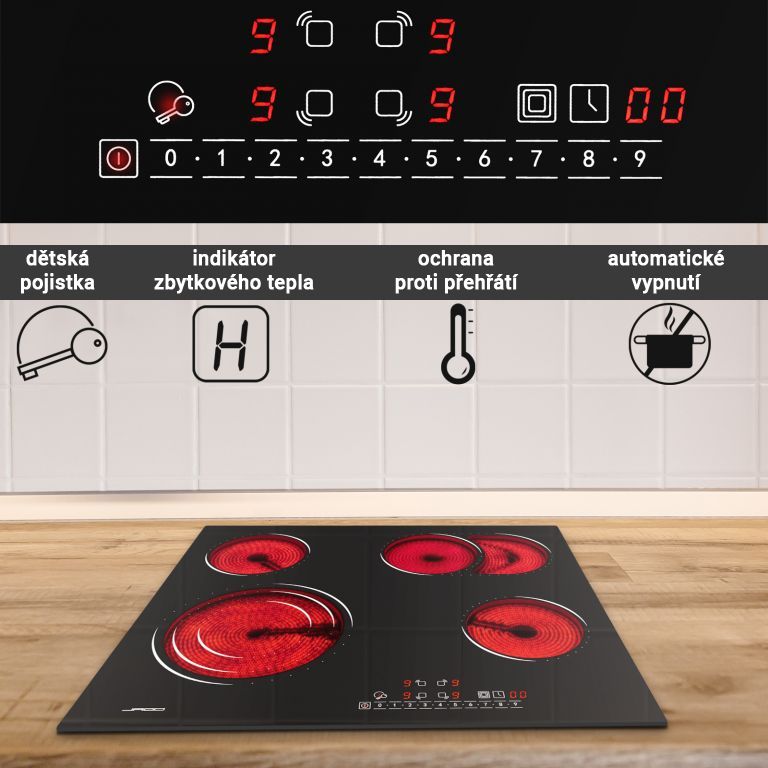 Nadaje się do wszystkich rodzajów naczyń (ceramicznych, ze stali nierdzewnej, żeliwa, aluminium, miedzi, szkła żaroodpornego itp.) Posiada technologię sterowania dotykowego i dziewięciostopniową regulację temperatury. Z kablem (5-żyłowym) bez wtyczki VDE. Funkcje bezpieczeństwa: zabezpieczenie przed dziećmi, wskaźnik ciepła resztkowego, zabezpieczenie przed przegrzaniem, automatyczne wyłączanie. Proste i intuicyjne sterowanie, dziewięć ustawień mocy i timer od 0 do 99 minut sprawiają, że ta płyta ceramiczna jest idealnym sprzymierzeńcem na lata przyjemności gotowania.