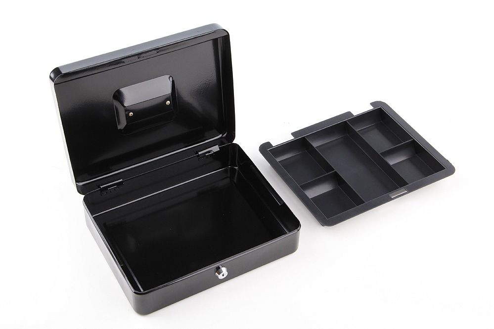 Przenośna kasa wykonana ze stali z dwoma kluczami zawiera wewnętrzną wyjmowaną wkładkę z tworzywa sztucznego i nadaje się do przechowywania wszystkich wartościowych przedmiotów.