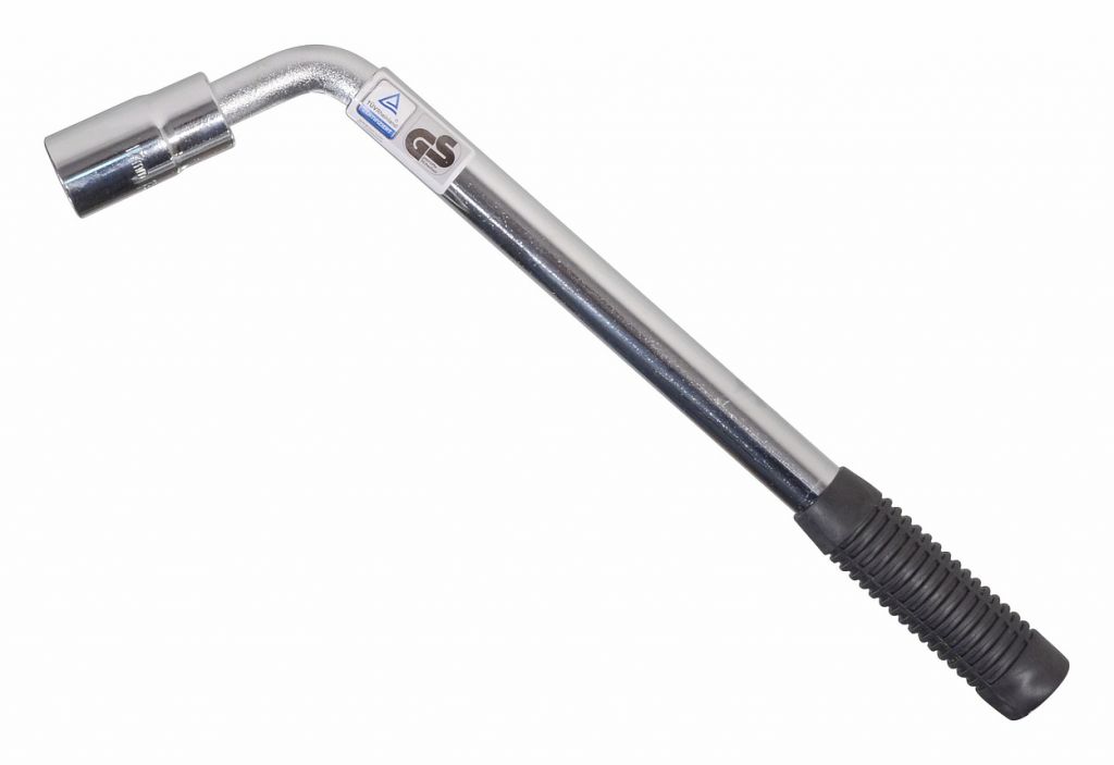 Teleskopowy metalowy klucz w kształcie litery L, który służy do odkręcania lub dokręcania nakrętek kół samochodowych.