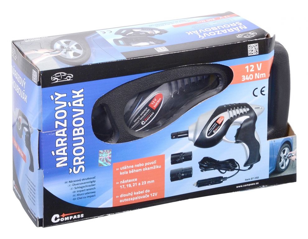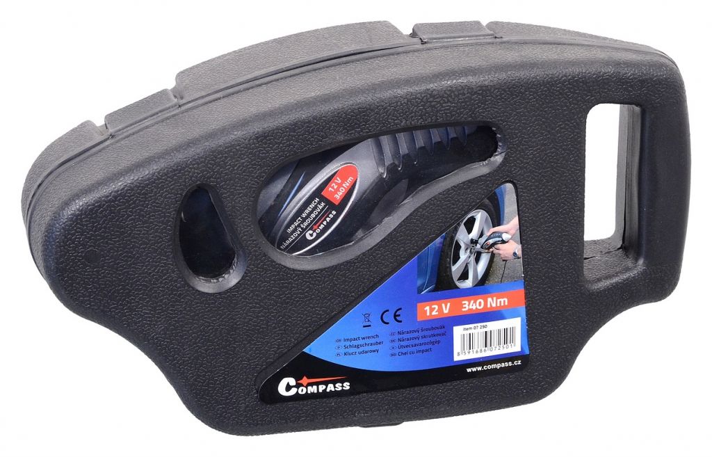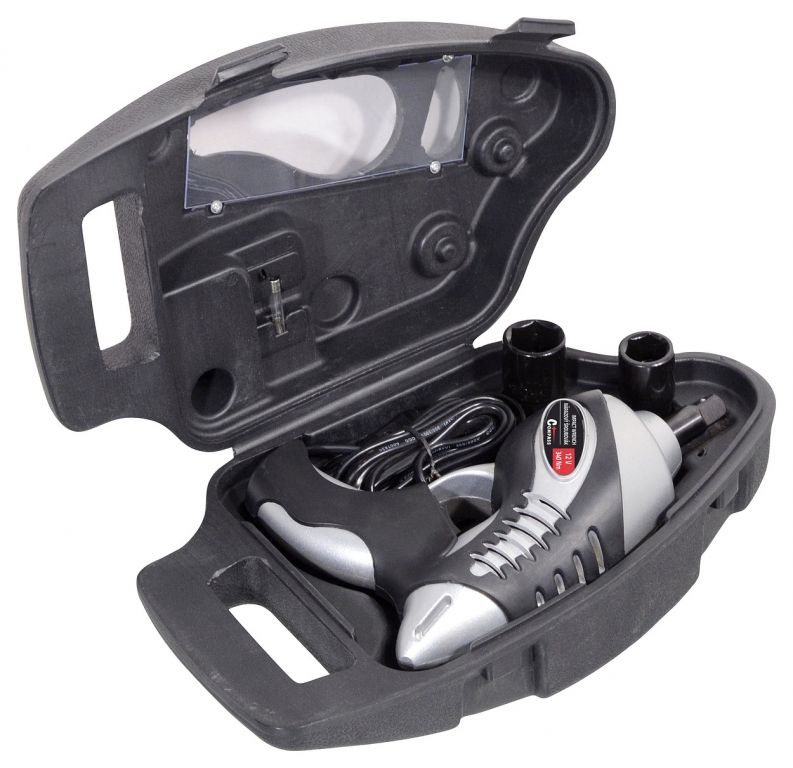 Wkrętarka udarowa z wtyczką do gniazda zapalniczki samochodowej 12 V przeznaczona jest do odkręcania i dokręcania nakrętek lub śrub kół. Jest dostarczany w zamykanej plastikowej obudowie i zawiera wymienne nasadki ze stali chromowo-wanadowej. Długi kabel pozwala na wygodne dokręcenie wszystkich kół pojazdu.