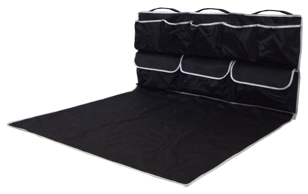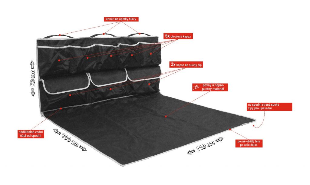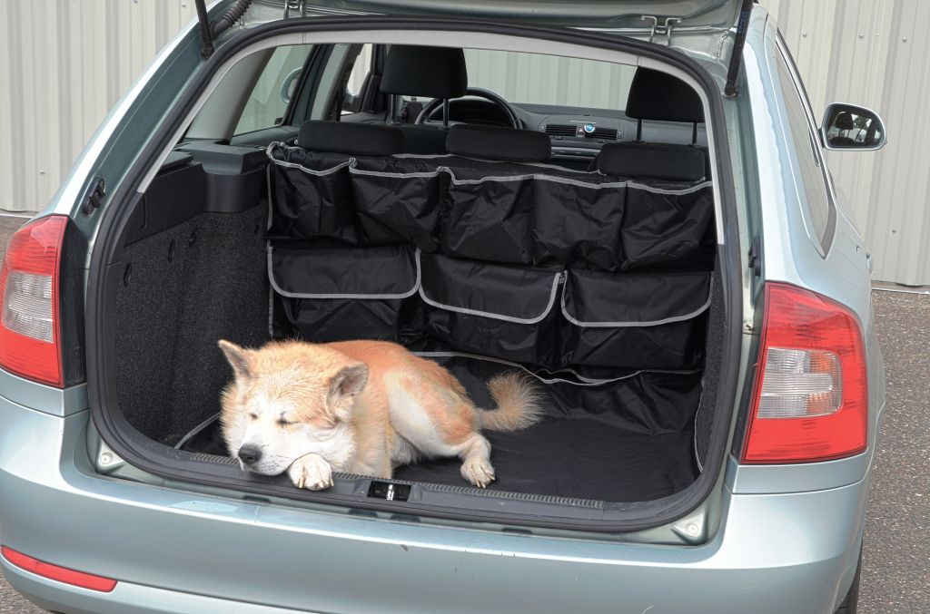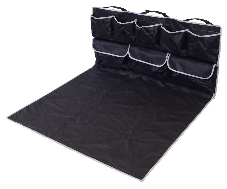 Koc ochronny do bagażnika samochodu, wyjątkowa konstrukcja, która chroni dolną i tylną część bagażnika, a także jest wyposażony w wiele praktycznych kieszeni, w tym zamykanych na zamek. Idealny do transportu psa lub brudnego ładunku w bagażniku. Jednocześnie pomaga utrzymać porządek, wkładając wiele małych rzeczy do kieszeni. Jest to uniwersalny rozmiar, można go łatwo przymocować, zaczepiając za zagłówkami tylnych siedzeń, a spód zapina się idealnie dzięki rzepowi. Wykonany z impregnowanego materiału, który można łatwo czyścić wilgotną szmatką lub gąbką za pomocą zwykłego detergentu.