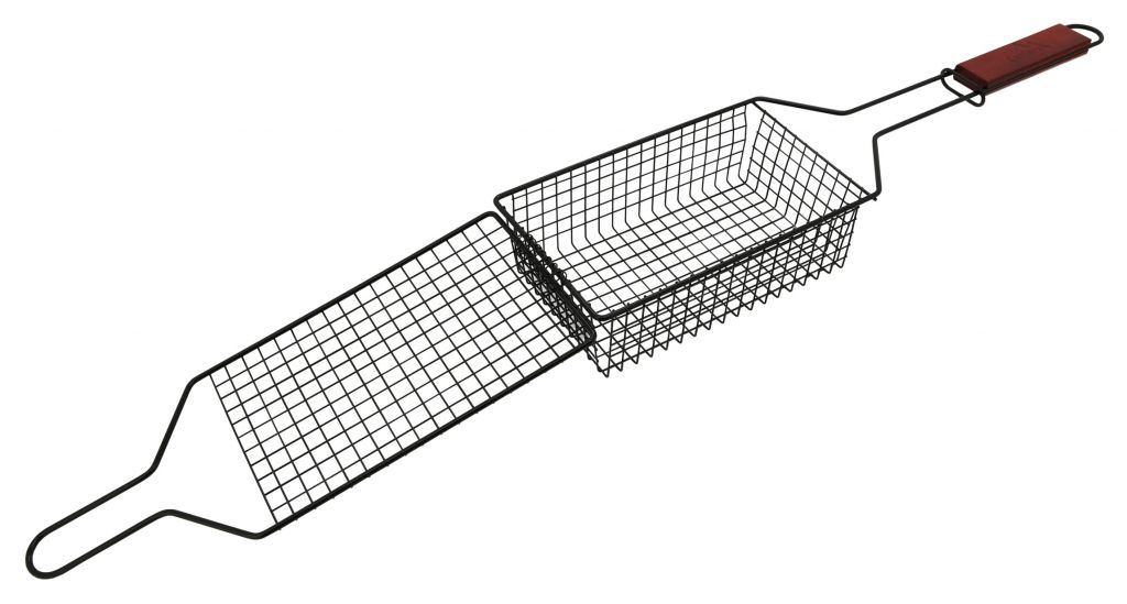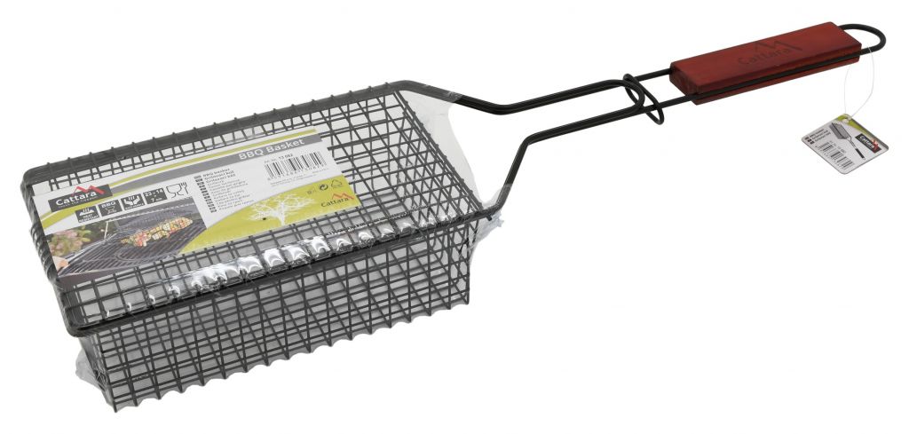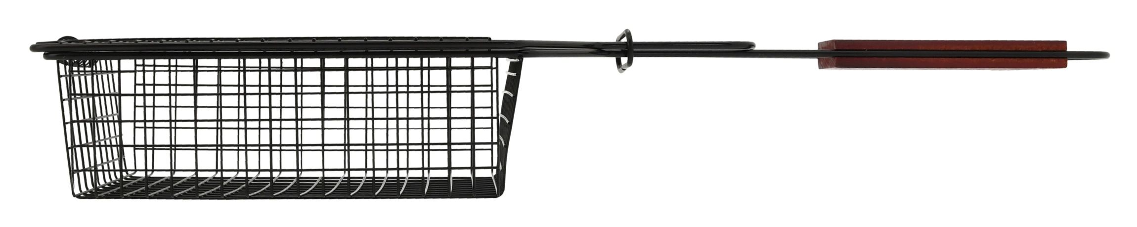 Kosz grillowy do grillowania warzyw, mieszanek i innych, zwłaszcza mniejszych potraw. Kosz wykonany z czarnej stali. Dzięki zastosowaniu drewnianej rączki zapewniona jest bezpieczna i wygodna obsługa. Przy rączce znajduje się pierścień, za pomocą którego można zabezpieczyć kosz przed niezamierzonym otwarciem.