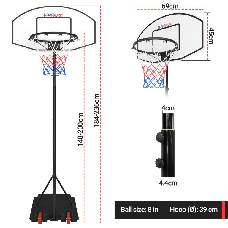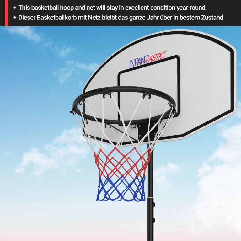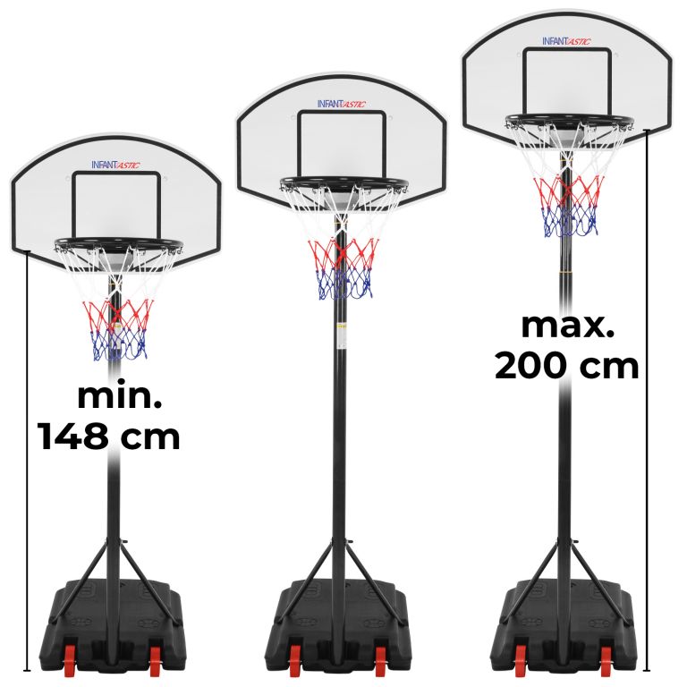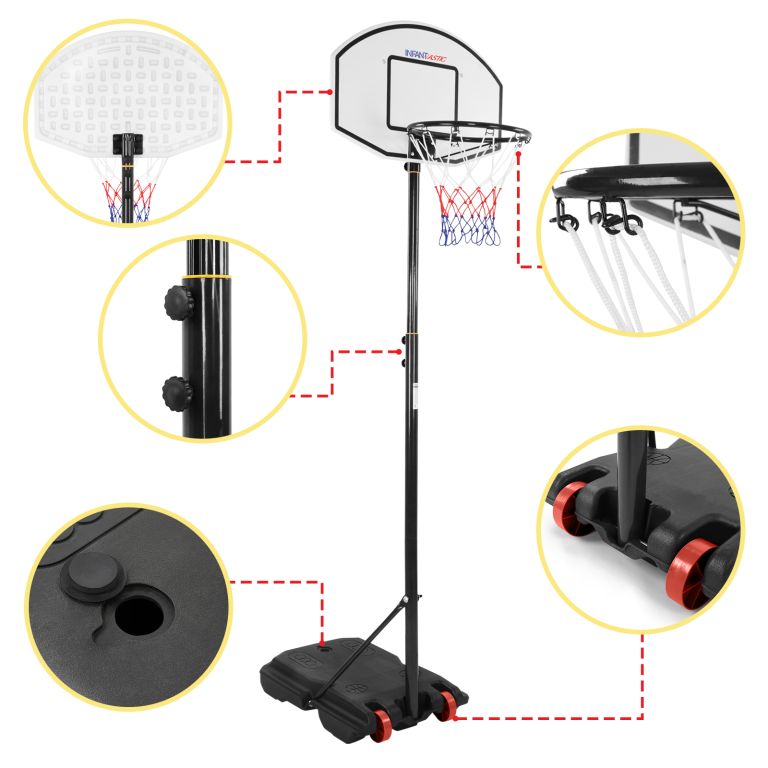 Niezależnie od tego, czy Twoje dziecko chce ćwiczyć swoje umiejętności koszykarskie, czy po prostu chce grać z przyjaciółmi dla zabawy, ta obręcz do koszykówki jest łatwa do zbudowania i można rozpocząć zabawę w strzelanie do kosza! Solidna podstawa jest szybka w budowie i wystarczy wypełnić ją wodą lub piaskiem, aby była stabilna. Stojak można regulować do wysokości 236 cm, dzięki czemu kosz może stać na wysokości 2 m. Kółka sprawiają, że ten system do koszykówki jest mobilny. Zarówno piłka do koszykówki (piłka), jak i pompka powietrza są dołączone, więc impreza może rozpocząć się natychmiast.