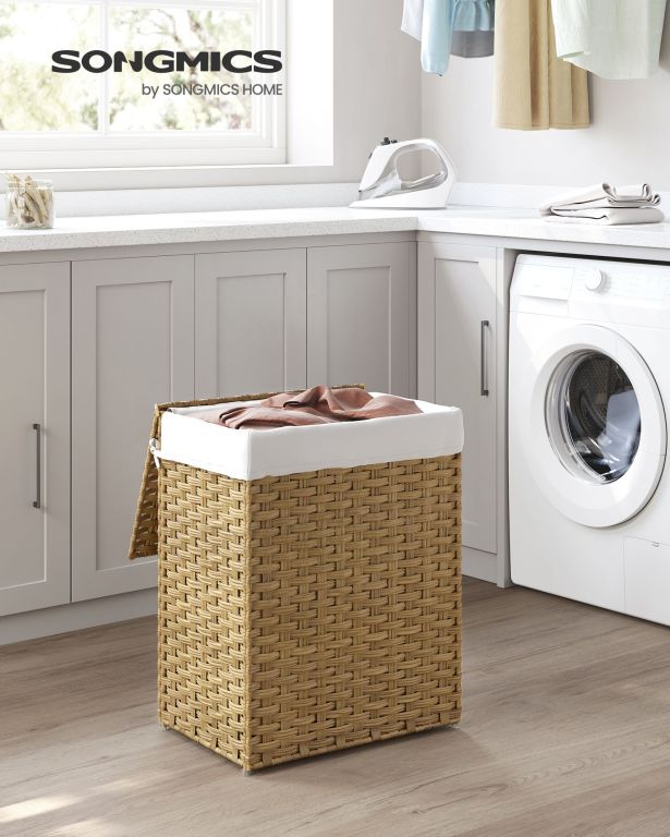 Wytrzymały rattan syntetyczny oraz stalowa rama zapewniają trwałość i odporność na wilgoć. Wyjmowana bawełniana wkładka pozwala łatwo przenosić pranie, a silikonowe nóżki chronią podłogę. Kosz można złożyć, oszczędzając miejsce podczas przechowywania.