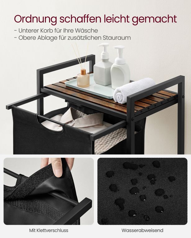 Stalowa rama i MDF zapewniają stabilność, a wyjmowany worek z Oxfordu ułatwia przenoszenie prania. Regulowane nóżki umożliwiają ustawienie na nierównej podłodze. Wentylowana półka ogranicza powstawanie nieprzyjemnych zapachów.