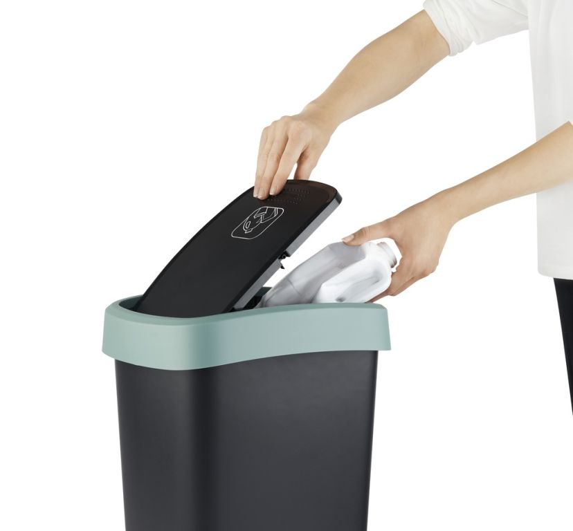 Plastikowy pojemnik na odpady z pokrywą na zawiasach. Dwa sposoby otwierania kosza. Jakość materiału i wykonania od szwajcarskiej marki Rotho.