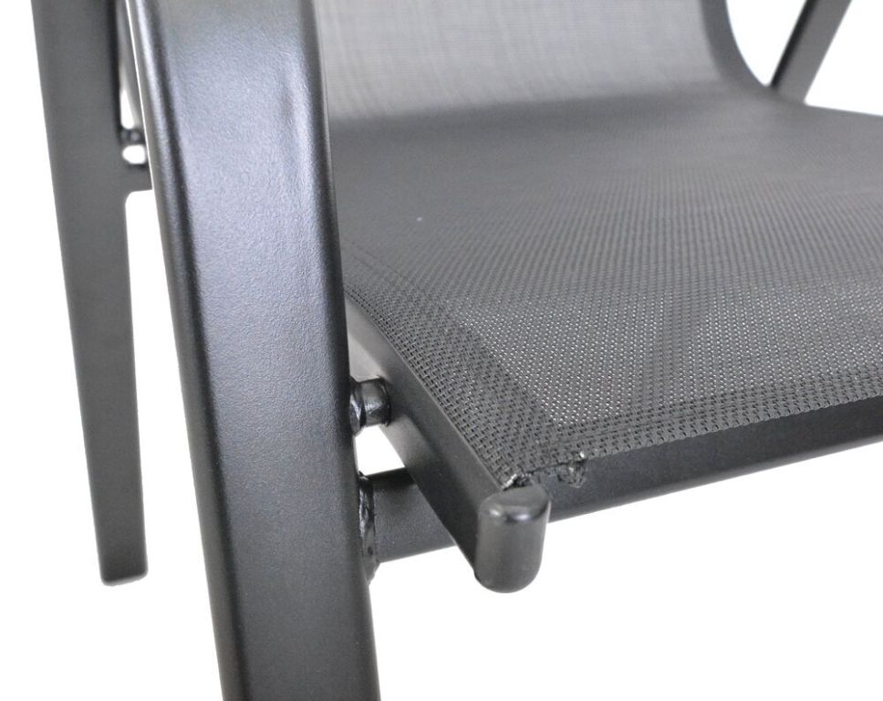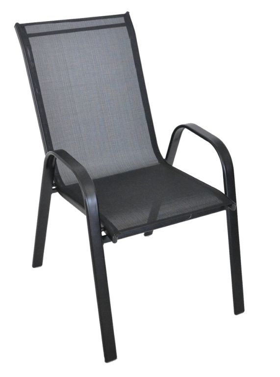 Krzesło ogrodowe z solidną metalową konstrukcją i tapicerką wykonaną z czarnej sztucznej tkaniny dla wygodnego relaksu w ogrodzie lub na tarasie.