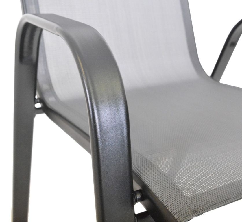 Ukazać szczegółowy opisKrzesło ogrodowe o solidnej metalowej konstrukcji i tapicerce ze sztucznej tkaniny w kolorze szarym