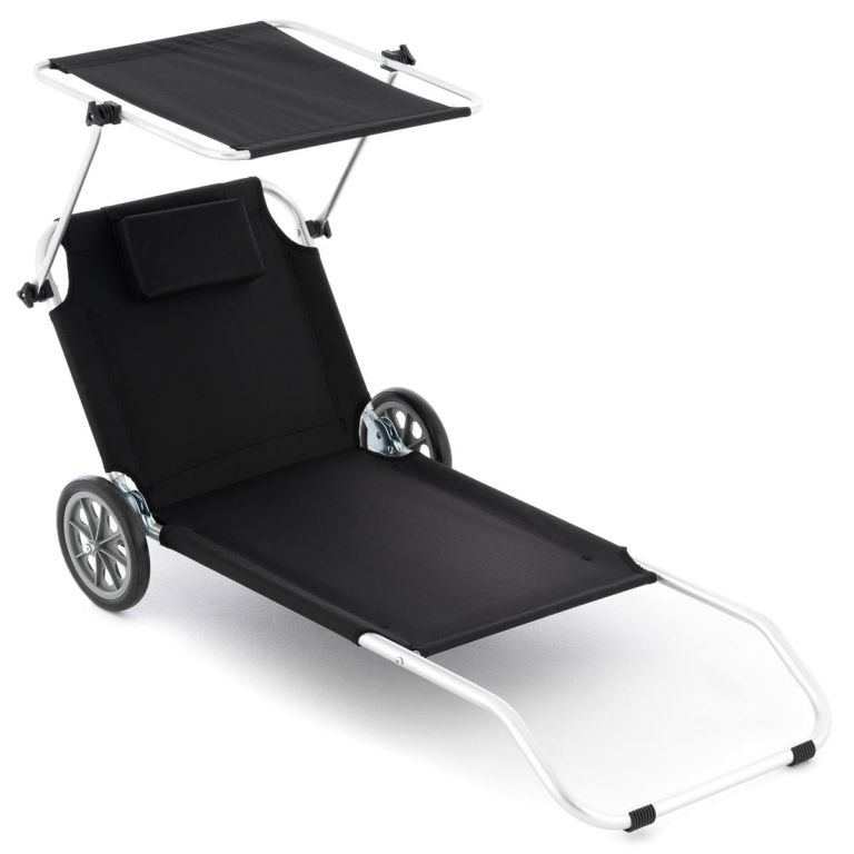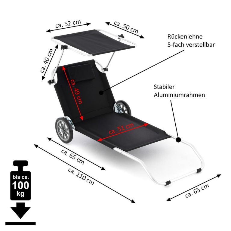 Tym praktycznym leżakiem możesz upiększyć taras, balkon, saunę, wellness lub ogród. Nadaje się do użytku wewnątrz i na zewnątrz, do użytku przy basenie lub na kempingu. Może być również używany jako pomoc w transporcie sprzętu plażowego. Osłona przeciwsłoneczna może być regulowana w sposób ciągły w razie potrzeby, aby zapobiec oparzeniom słonecznym. Wysokiej jakości stelaż, szybkoschnąca, odporna na rozdarcia powierzchnia do leżenia, praktyczna poduszka relaksacyjna pod głową zapewniająca przyjemną pozycję do leżenia, to wszystko cechy tego leżalka. Przyjemny komfort leżenia zapewnia oparcie regulowane w pięciu kierunkach z praktyczną przegrodą z siatki. Składanie zajmujące mało miejsca - łatwe w transporcie dzięki 2 stabilnym kółkom.