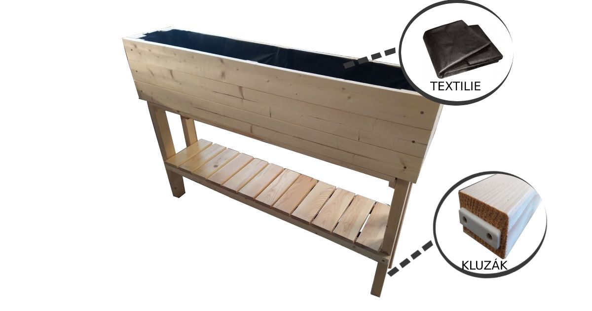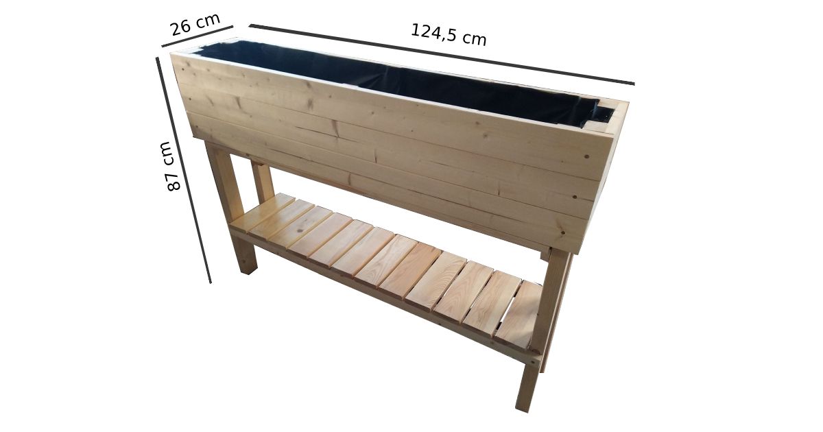Kwietnik jest podniesiony, aby ułatwić pracę bez schylania się i klęczenia. Wykonany jest z materiału o grubości 20 mm, a nogi mają grubość 40 x 60 mm. Półki do przechowywania narzędzi do uprawy i sadzenia. Geowłókniny są częścią opakowania produktu i służą do oddzielenia gleby od kwietnika. Od spodu łóżko ma plastikową prowadnicę dla lepszej stabilności i tak, aby drewniane nogi nie stykały się z podłożem. Klomb nadaje się do uprawy na balkonie lub w domu na tarasie.