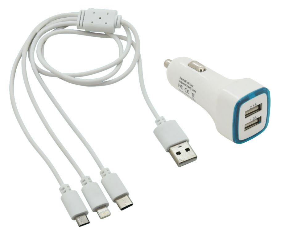 Ładowarka, wtyczka USB do gniazda zapalniczki samochodowej 12V lub 24V. Oprócz wtyczki USB w zestawie znajduje się również kabel zasilający 3w1 do iPhone'a, microUSB i USB C. Nadaje się do odtwarzaczy MP3, telefonów komórkowych i innych urządzeń ładowanych lub zasilanych ze standardowego źródła USB 5V do 2100mA.