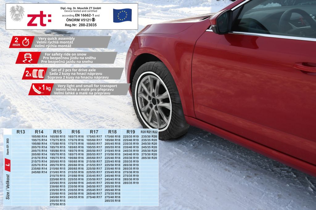 Tekstylne łańcuchy śniegowe, z bardzo szybkim i łatwym montażem, spełniają europejskie normy, w tym austriacki wymóg „ÖNORM V 5121”.