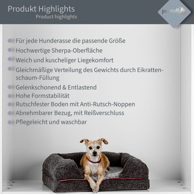 Nasze łóżeczko nadaje się również jako dodatek do szopy, klatki lub skrzyni transportowej. Dzięki zakrzywionemu kształtowi ściółki, ciężar rozkłada się równomiernie i amortyzuje wstrząsy, co jest nie tylko wygodne, ale również chroni stawy zwierzęcia. Zamek błyskawiczny umożliwia łatwe zdjęcie pokrowca i wypranie go ręcznie lub w niskich temperaturach. Dodatkowo hydrofobowa folia wewnętrzna chroni piankę przed zabrudzeniem. Łóżeczko ma podwyższoną i wyściełaną krawędź, a spód wykonany jest z wytrzymałego materiału, dzięki antypoślizgowym guzikom zmniejsza się poślizg.