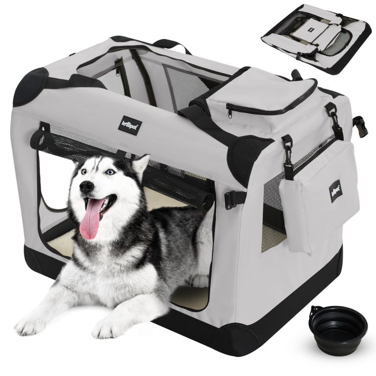Składany transporter dla psa z ergonomicznymi uchwytami, zmywalną poduszką i miską. Podróżuj bez stresu i z maksymalnym komfortem.