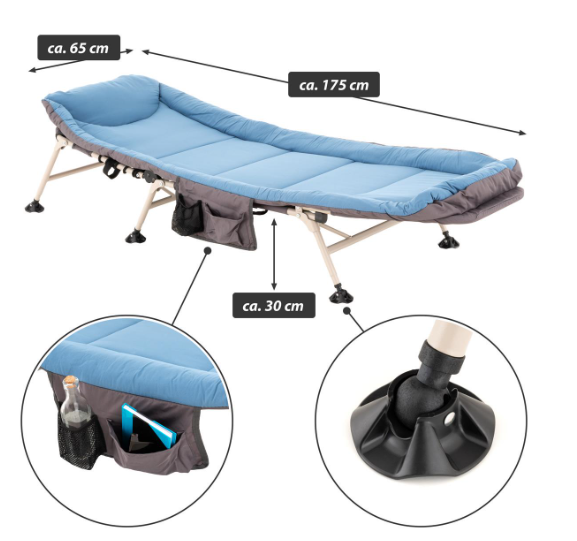 Ten nowoczesny leżak wędkarski w kolorze jasnoniebieskim/szarym ma lekką stalową konstrukcję zaprojektowaną z myślą o dobrej trwałości i stabilności oraz łatwej obsłudze. Oparcie można bezstopniowo regulować w celu uzyskania optymalnej, relaksującej pozycji leżącej i siedzącej. Leżak Fischer można złożyć w celu wygodnego transportu. Wyposażony w 6 nóżek do bezpiecznego stania i wyściełany pianką zagłówek. Mniejsze przedmioty można przechowywać w bocznej kieszeni po prawej stronie. Powierzchnia leżąca wykonana w 100% z poliestru jest wodoodporna i izoluje termicznie. Zwróć również uwagę na inne nasze meble ogrodowe, takie jak krzesła składane, krzesła sztaplowane, krzesła bistro, taborety, ławki, stoły wykonane z drewna lub metalu, a także parasole i stojaki na parasole.