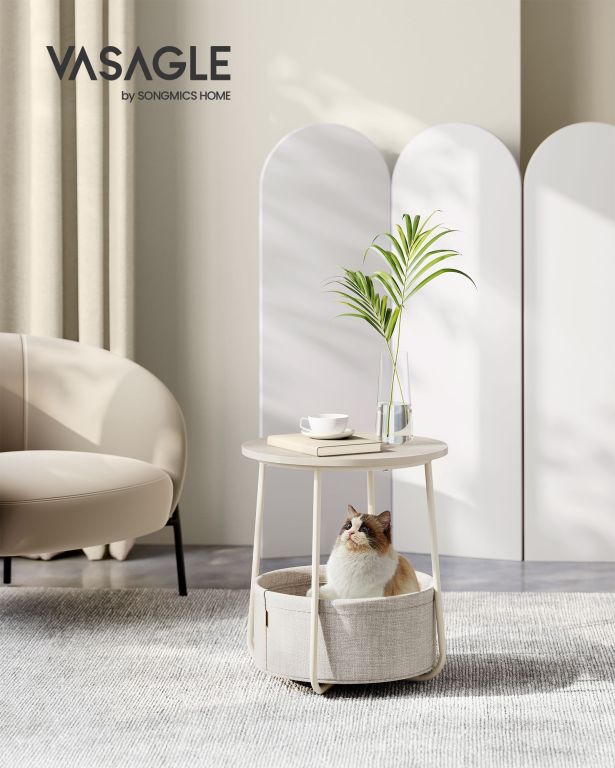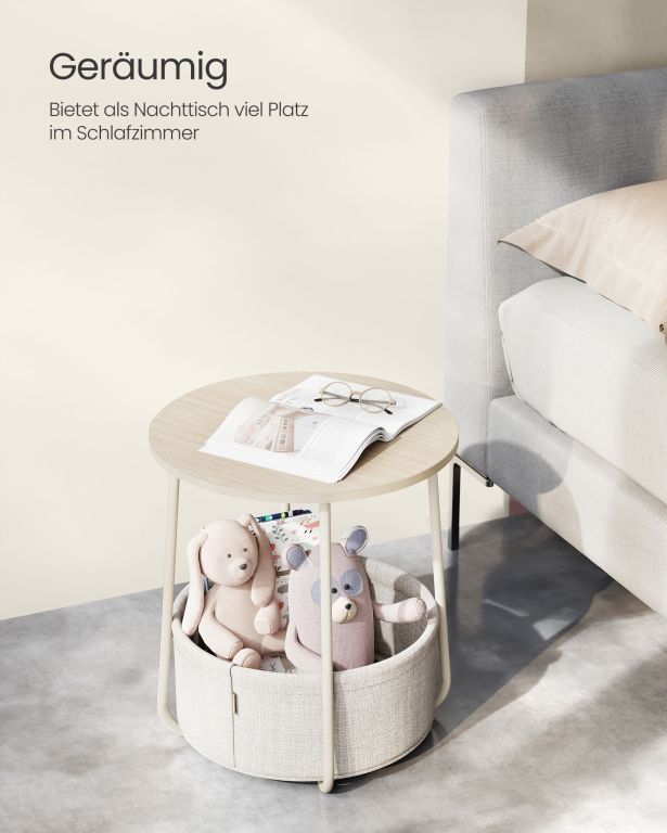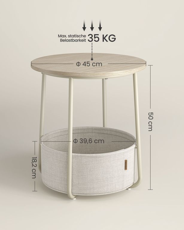 Stwórz przytulny kącik w swoim domu dzięki temu małemu stolikowi z praktycznym koszem. Kosz z tkaniny pozwala na wygodne przechowywanie, a kremowy kolor dodaje lekkości każdemu wnętrzu.