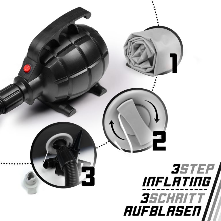 Produkt wykonany z dwuwarstwowego PVC o grubości 0,9 mm zapewnia odporność na uszkodzenia i długą żywotność. Łatwa obsługa pompy pozwala szybko przygotować matę do użycia, a zestaw naprawczy umożliwia samodzielną naprawę drobnych uszkodzeń.