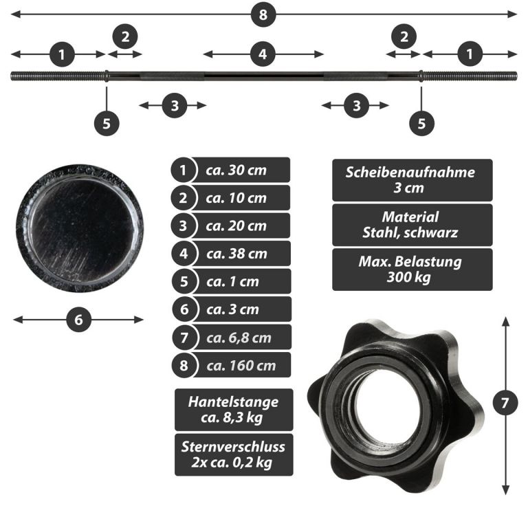 Optymalna sztanga do użytku na siłowni i w domu, odpowiednia do treningu klatki piersiowej, ramion, szyi, wzmocnienia, sportów rehabilitacyjnych, kulturystyki, wyciskania na ławce, martwego ciągu, przysiadów, wypadów, pompek i innych. Nadaje się do dostępnych płyt obciążających z uchwytem tarczy 3 cm i otworem o średnicy 30/31 mm. Płytka antypoślizgowa jest zabezpieczona pierścieniem zabezpieczającym, aby zapobiec przesuwaniu się ciężarka podczas ruchu. Blokada gwiaździsta, które można szybko wymienić, bezpiecznie mocują obciążniki na sztangi i zapewniają łatwą zmianę ciężaru. Uchwyty są żebrowane krzyżowo, co zapewnia pewny chwyt.