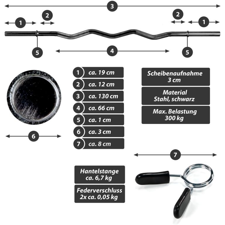 Zakrzywiony kształt gryfu pozwala na różne opcje chwytu do treningu różnych partii mięśni i pozwala na trenowanie określonych grup mięśni, a także skomplikowanych ćwiczeń całego ciała. Idealny do wymagającego treningu z mniejszym obciążeniem nadgarstka niż ze sztangą jednoręczną. Dzięki zakrzywionemu kształtowi sztanga nadaje się szczególnie do efektywnego i wydajnego treningu ramion. Blokady sprężynowe można stosunkowo szybko przesunąć i ponownie zamocować, co gwarantuje mocne zamocowanie ciężaru.
