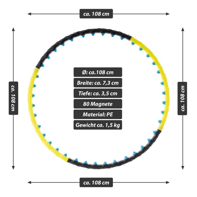 Zabudowane na stałe brodawki masujące i zawartych w nich 80 magnesów służą nie tylko do masażu, ale także do wspomagania samoleczenia i procesu odchudzania. Optymalna obręcz rozciąga się od podłogi w przybliżeniu do pępka. Pałąk można zabrać i używać praktycznie wszędzie, a poszczególne segmenty można złożyć w mgnieniu oka.