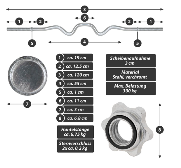 Zakrzywiony kształt gryfa pozwala na różne opcje chwytu, aby wykorzystać różne części mięśni ramion i pozwala na ukierunkowane ćwiczenia określonych grup mięśni, a także kompleksowe ćwiczenia całego ciała. Idealny do wymagającego treningu przy mniejszym obciążeniu nadgarstków niż w przypadku sztangi. Dzięki zakrzywionemu kształtowi hantla MAXXIVA jest szczególnie odpowiednia do skutecznego i wydajnego treningu ramion. Kompatybilny ze wszystkimi obciążnikami 30 mm, w tym 1 parą blokad gwiazdowych. Blokady gwiazdowe można stosunkowo szybko zwolnić, a następnie bezpiecznie ponownie zamocować, gwarantując pewne trzymanie ciężarków. Zwróć również uwagę na nasze inne artykuły fitness, takie jak hantle, drążki do podciągania, piłki do ćwiczeń, maty, deski do balansowania, steppery i wiele innych, aby skompletować swoją domową siłownię.