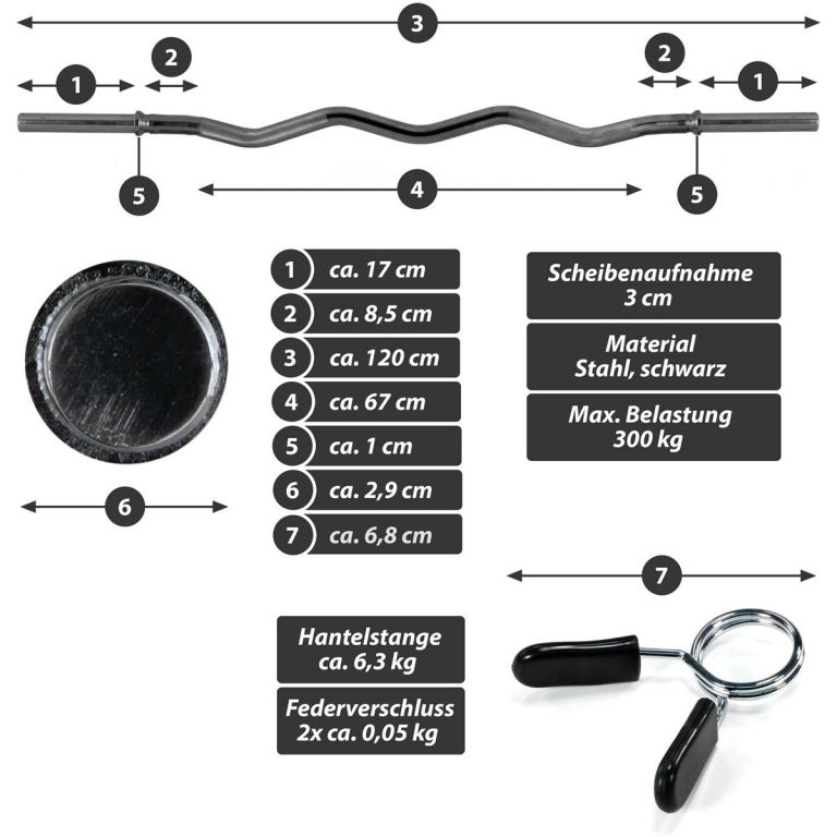Optymalna sztanga do użytku na siłowni i w domu. Zakrzywiony kształt gryfu pozwala na różne opcje chwytu w celu wykorzystania różnych części mięśni ramion i pozwala na celowanie w określone grupy mięśni, a także złożone ćwiczenia całego ciała. Idealny do wymagającego treningu z mniejszym obciążeniem nadgarstka. Dzięki zakrzywionemu kształtowi nadaje się szczególnie do efektywnego i wydajnego treningu ramion. Nadaje się do dostępnych obciążeń o średnicy otworu 30 mm. Sprężyny szybkowymienne mocują ciężarki bezpiecznie do sztangi i zapewniają łatwą zmianę ciężaru.