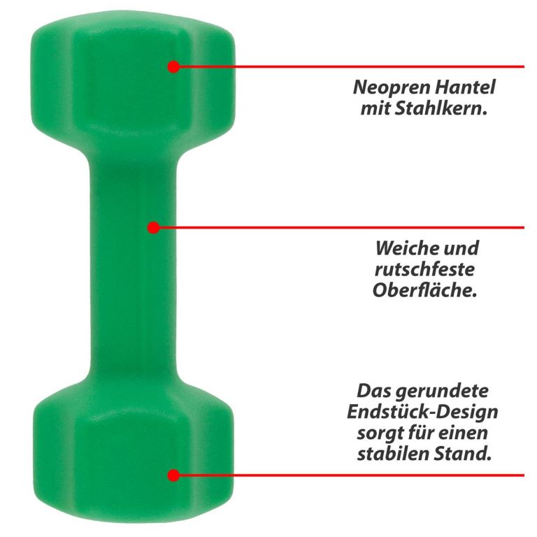 Optymalne hantle do użytku na siłowni i w domu, odpowiednie do treningu klatki piersiowej, ramion, bicepsów i tricepsów. Hantle pokryte są warstwą neoprenu, która tworzy miękką i antypoślizgową powierzchnię, która jest łatwa i wygodna w trzymaniu oraz odporna na pot. Rdzeń wykonany z wysokiej jakości stali gwarantuje długą żywotność. Zaokrąglona konstrukcja końcówek zapewnia stabilne położenie, co zapewnia bezpieczeństwo i zapobiega staczaniu się. Neoprenowy pokrowiec zapobiega uszkodzeniu podłogi lub przestrzeni magazynowej.