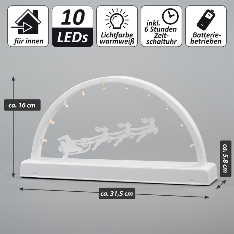 Ten półokrągły metalowy łuk świetlny, wyposażony w 10 ciepłobiałych diod LED, stworzy świąteczną atmosferę w Twoim domu, będzie pięknie przyciągał wzrok i świątecznie udekoruje Twoje okno. Ciepłe oświetlenie dekoracyjnego świecznika z motywem Świętego Mikołaja na saniach i reniferów tworzy przytulną atmosferę w okresie adwentu i świąt Bożego Narodzenia. Niskie zużycie energii przez mostek świecowy dzięki technologii LED. Zasilanie bateryjne oznacza niezależność od gniazdek i możliwość umieszczenia łuku świetlnego w dowolnym miejscu w pomieszczeniu. Stopień ochrony IP20 - przetestowany pod kątem bezpieczeństwa. Ustaw czas świecenia na 6 godzin, a następnie 18-godzinną przerwę. Dzięki temu nie trzeba włączać lampy o zmierzchu ani myśleć o jej wyłączeniu w środku nocy. Opcjonalny timer lub funkcja światła ciągłego. Uzupełnij swoje świąteczne dekoracje innymi wspaniałymi zimowymi, bożonarodzeniowymi i letnimi dekoracjami świetlnymi, takimi jak łańcuchy świetlne, drzewa świetlne, siatki świetlne, kurtyny świetlne, gałęzie LED, bombki, gwiazdy, renifery, latarnie i świece z naszej oferty.