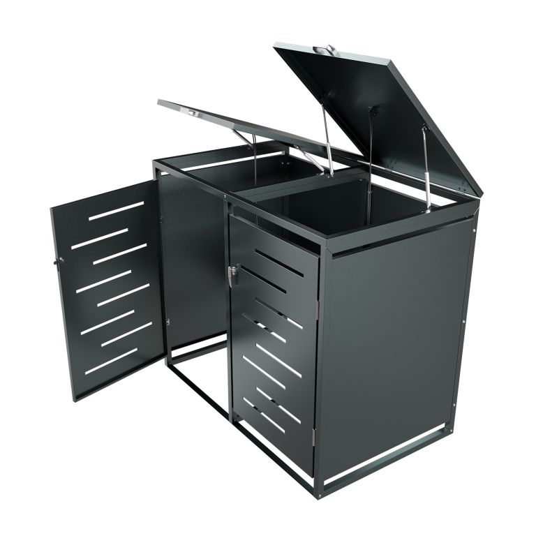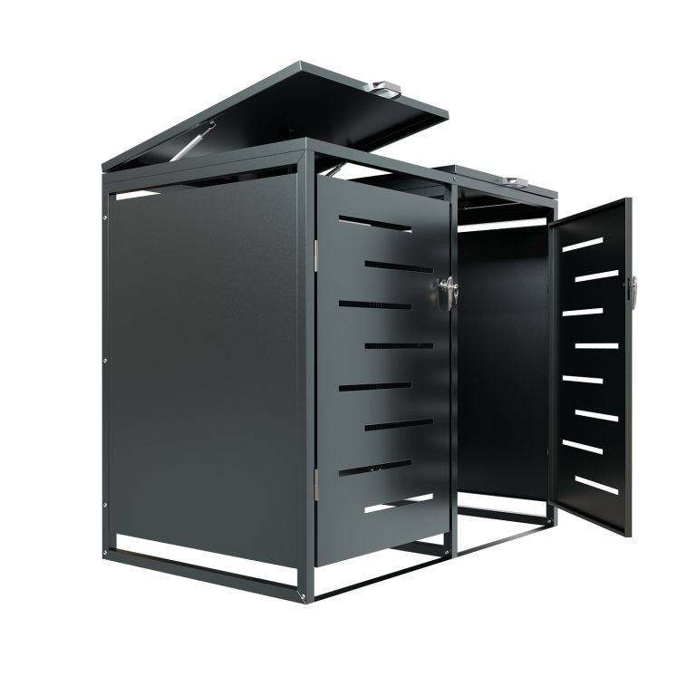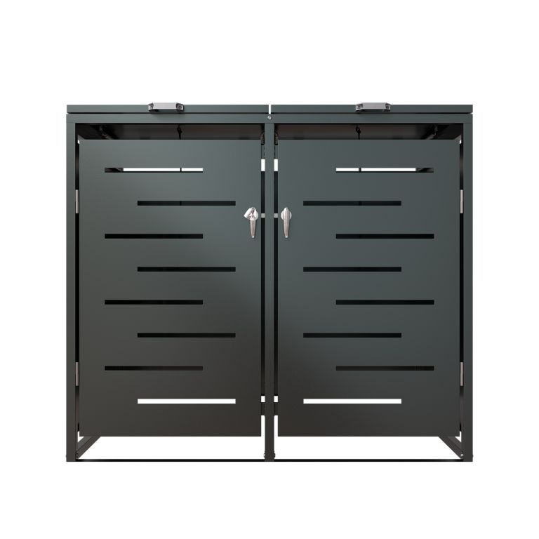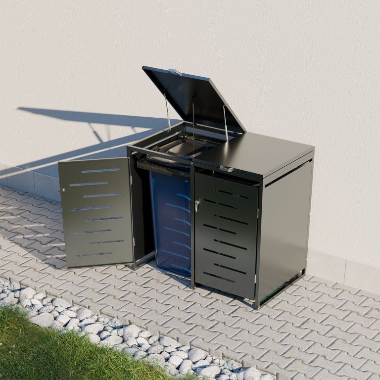 Utrzymaj swoją przedogródek w eleganckim i uporządkowanym stylu – nawet kosze na śmieci zasługują na schowek. Ten dwumiejscowy metalowy schowek na kosze to idealne rozwiązanie, które pozwala ukryć nieestetyczne pojemniki, chroniąc je jednocześnie przed deszczem, wiatrem i nieproszonymi gośćmi. Nowoczesne antracytowe wykończenie i dyskretne otwory wentylacyjne dodają każdej przestrzeni schludnego wyglądu.