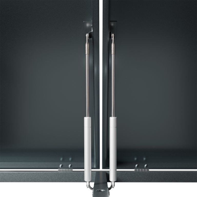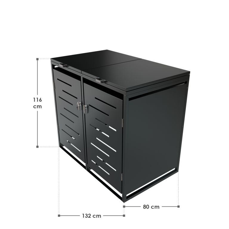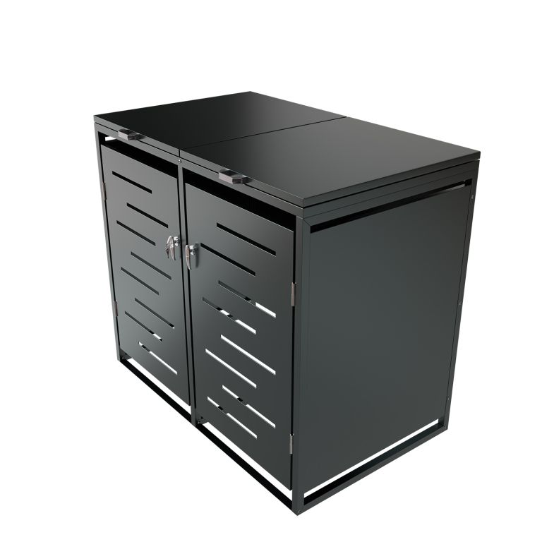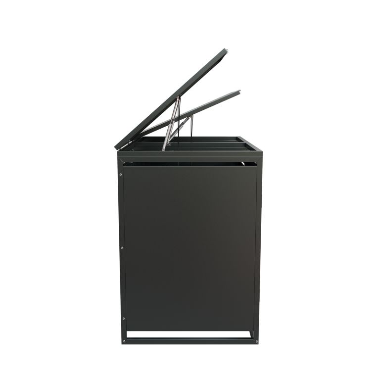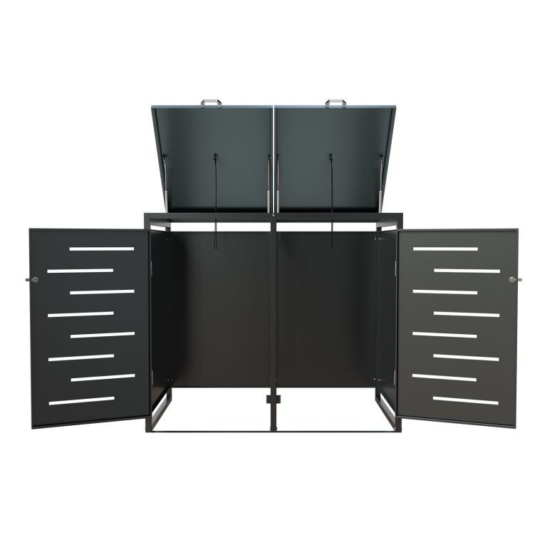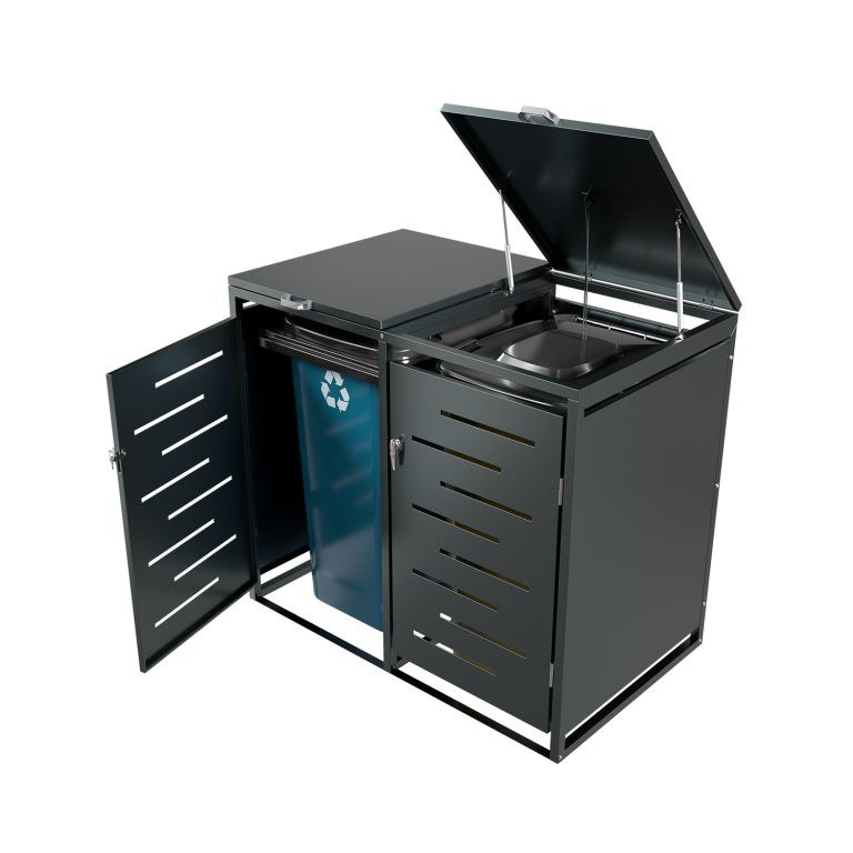 Konstrukcja ze stali ocynkowanej zapewnia wysoką odporność na warunki atmosferyczne i łatwość w utrzymaniu czystości. Górna pokrywa z podnośnikiem gazowym umożliwia prosty dostęp do pojemników o pojemności 120–240 litrów. Przednie drzwi wyposażone są w zamek, co gwarantuje, że nikt niepowołany nie będzie miał dostępu do zawartości. Schowek można rozbudować o dodatkowy moduł na 3 lub 4 kosze.