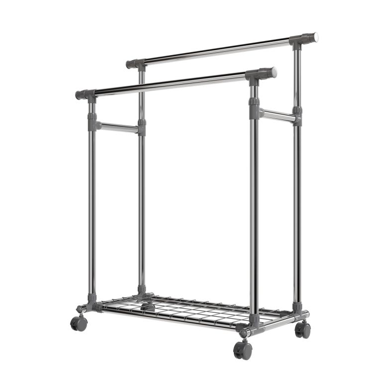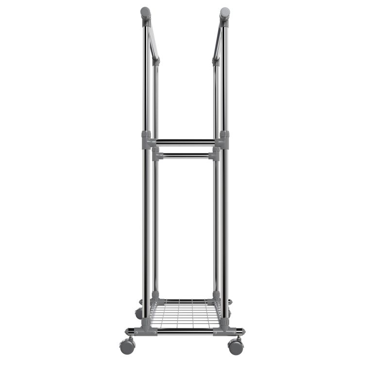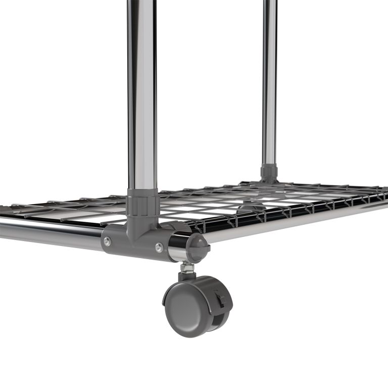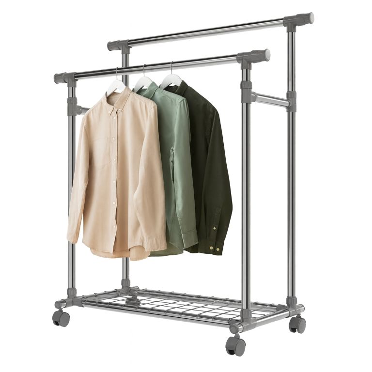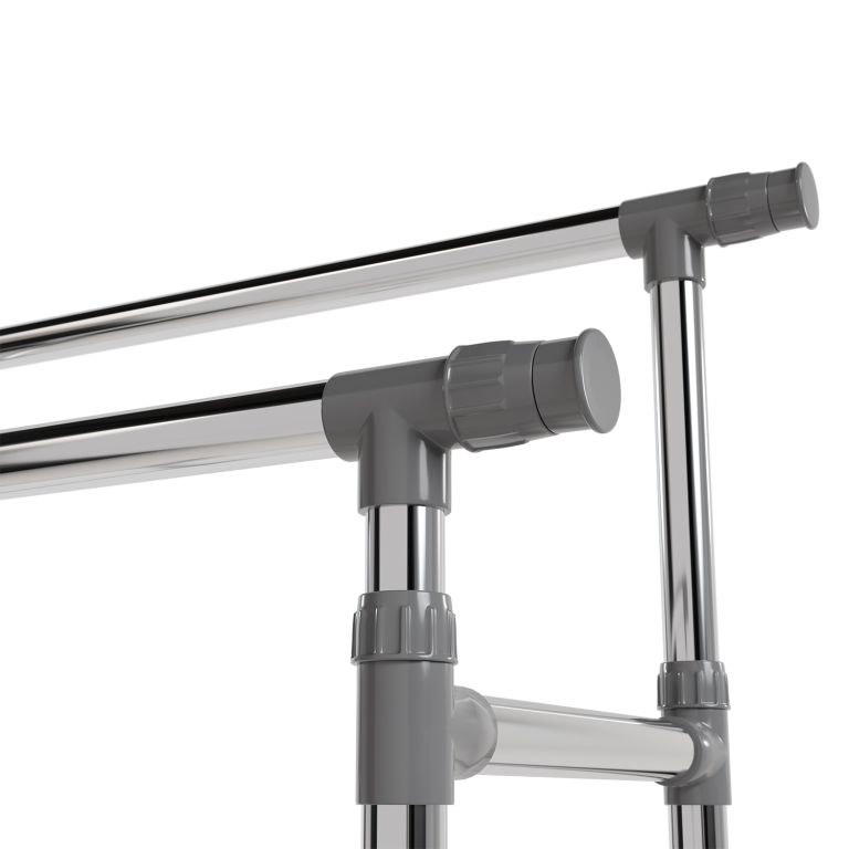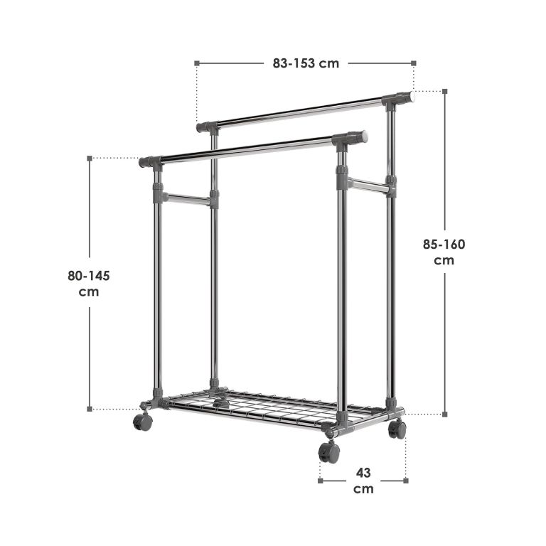 Wieszak jest lekki, a jednocześnie stabilny – solidne metalowe rury utrzymują do 17 kg na każdym drążku, a dolna półka pomieści dodatkowe akcesoria. Wysuwane boczne części dodają przestrzeni, gdy jest potrzebna, a kółka umożliwiają łatwe przemieszczanie. Jeśli cenisz praktyczne i lekkie rozwiązania, ten mobilny wieszak pomoże utrzymać porządek nawet w mniejszych pomieszczeniach.