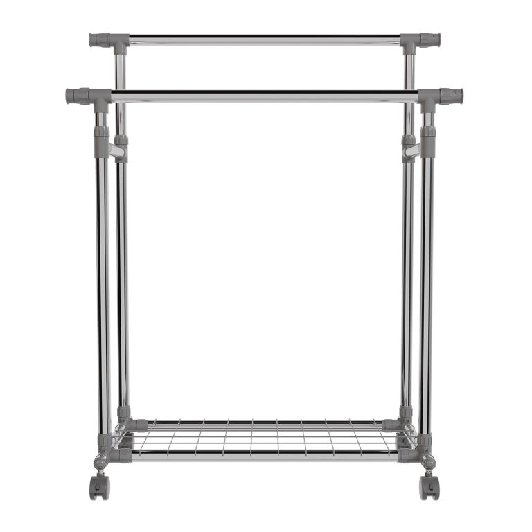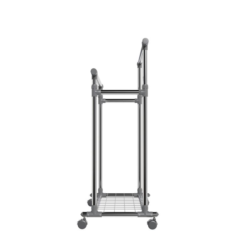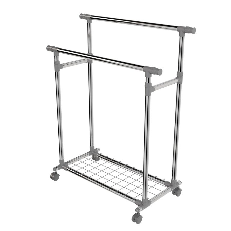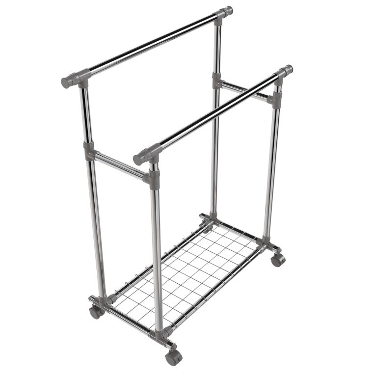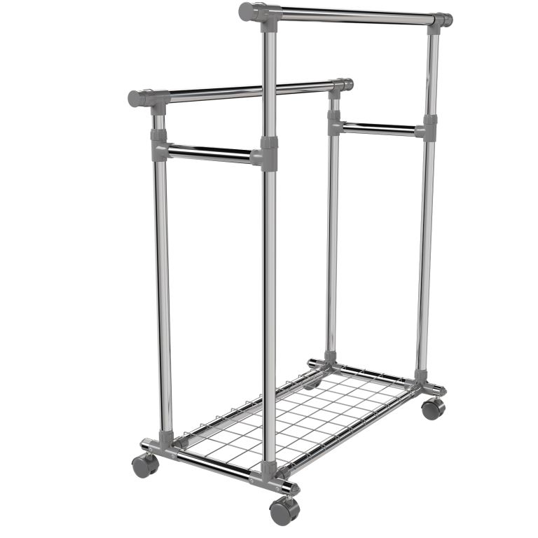 Metalowy wieszak na ubrania na kółkach, 2 drążki + półka