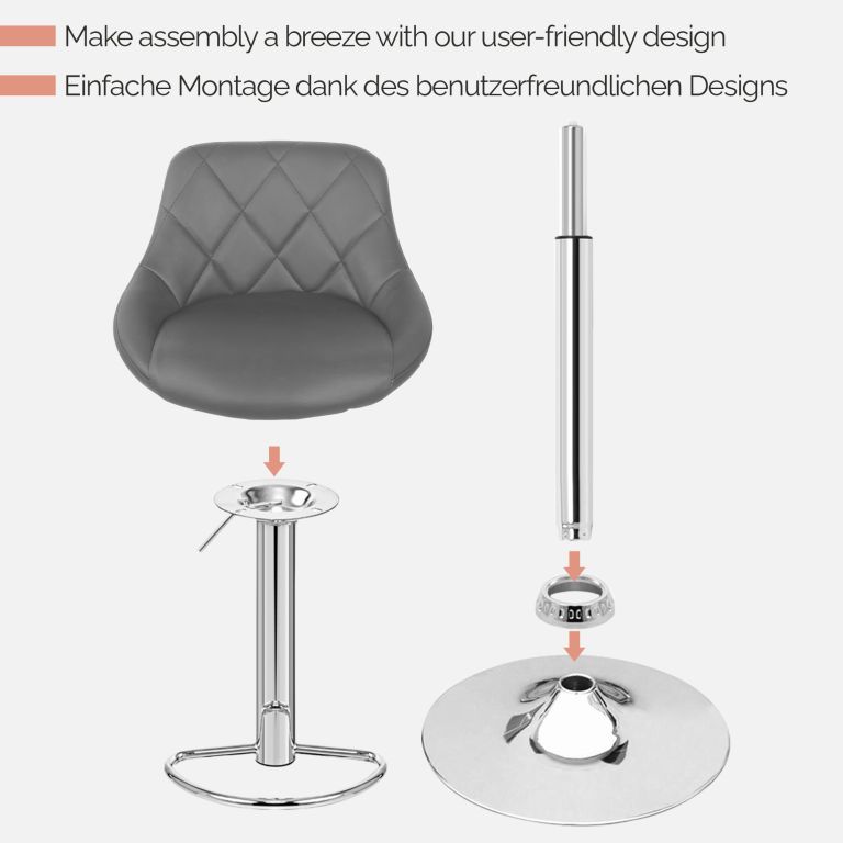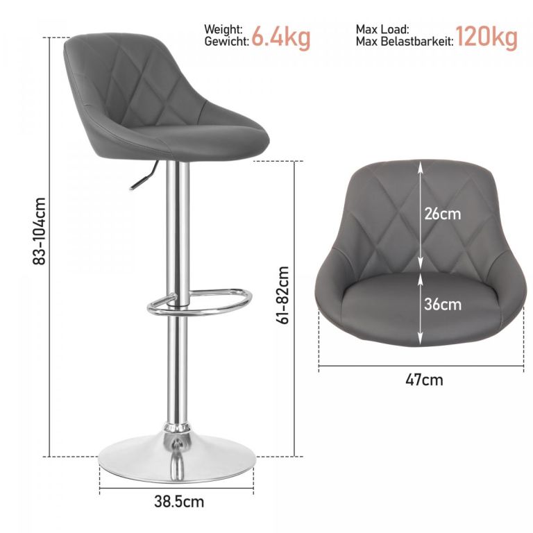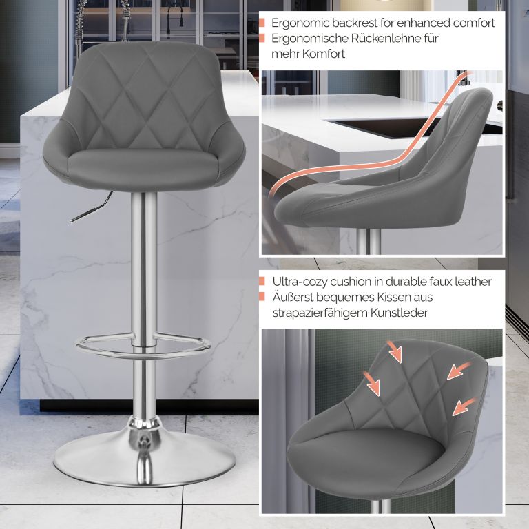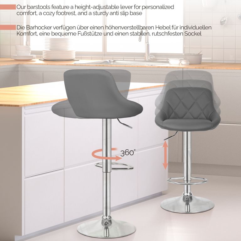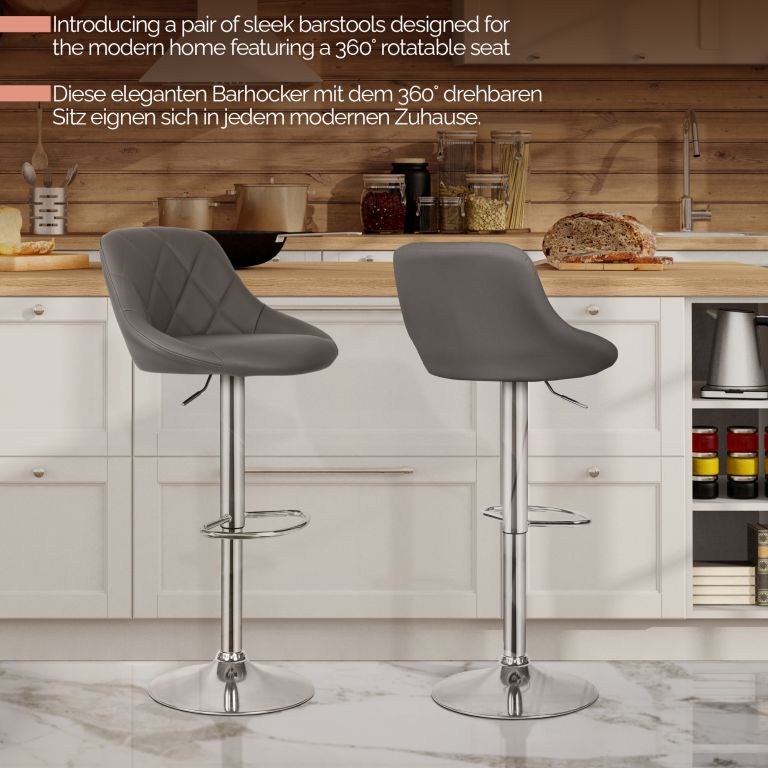 Odmień swoją przestrzeń dzięki tym eleganckim stołkom barowym, które idealnie nadają się do kuchni, baru lub biura. Mechanizm regulacji wysokości sprawia, że można je dopasować do każdej wysokości blatu, a chromowana stalowa rama i zaokrąglona podstawa o wysokości 38,5 cm zapewniają solidność i stabilność. Siedziska są tapicerowane łatwą w pielęgnacji imitacją skóry i oferują maksymalny komfort dzięki obszernej piankowej wyściółce o grubości 5 cm. Dzięki imponującej nośności 120 kg, stołki te są odpowiednie dla szerokiego grona użytkowników. Każdy zestaw składa się z dwóch stołków barowych z obrotowym siedziskiem 360°, zintegrowanym podnóżkiem, regulowaną sprężyną gazową i solidną podstawą.