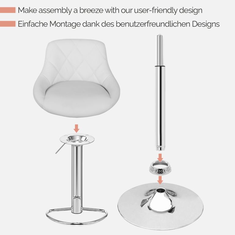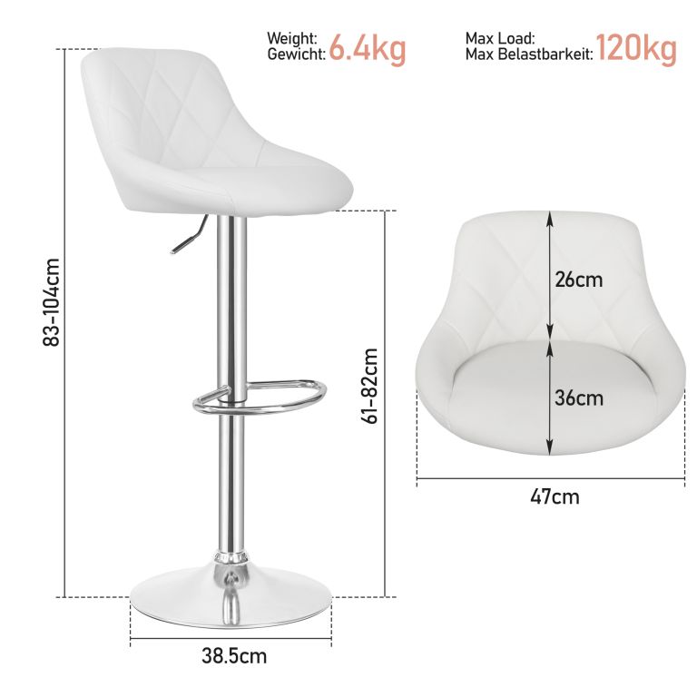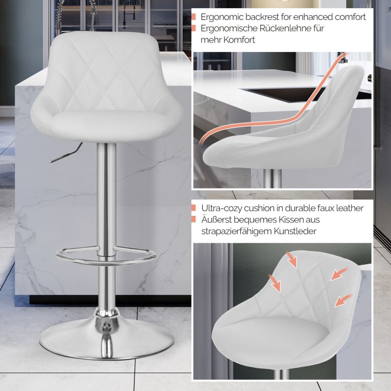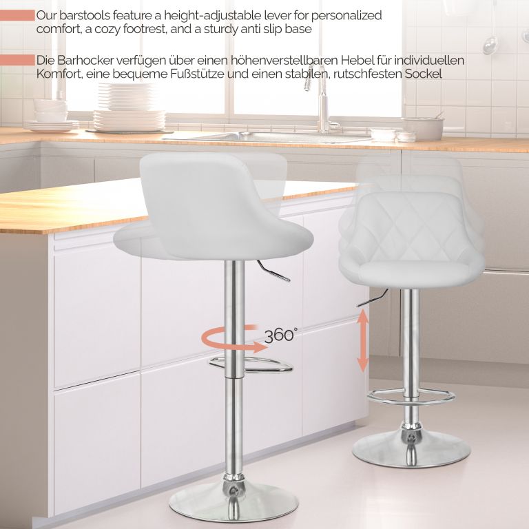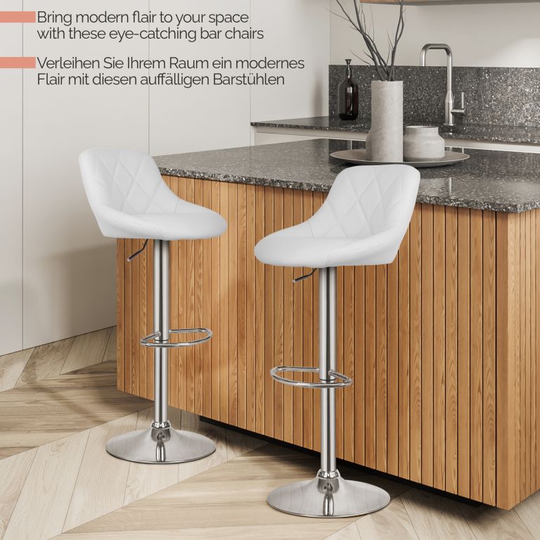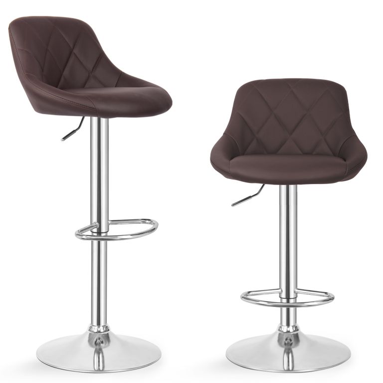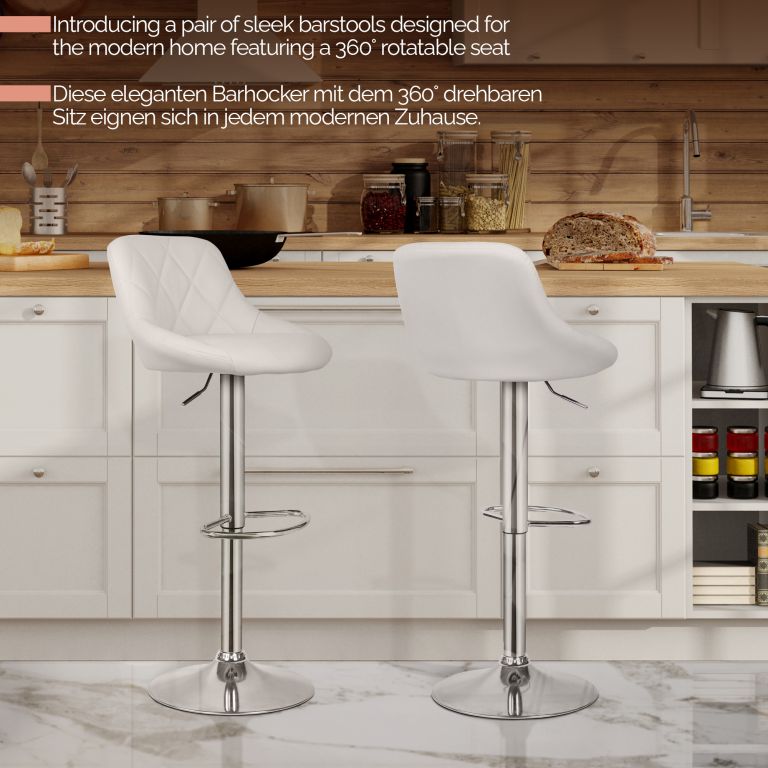 Odmień swoją przestrzeń dzięki tym eleganckim stołkom barowym, które są idealne do kuchni, baru lub biura. Mechanizm regulacji wysokości sprawia, że można je dopasować do każdej wysokości blatu, a chromowana stalowa rama i zaokrąglona podstawa o wysokości 38,5 cm zapewniają wytrzymałość i stabilność. Siedziska są tapicerowane łatwą w pielęgnacji imitacją skóry i oferują maksymalny komfort dzięki obszernej piankowej wyściółce o grubości 5 cm. Dzięki imponującej nośności 120 kg, stołki te są odpowiednie dla szerokiego grona użytkowników. Każdy zestaw składa się z dwóch stołków barowych z obrotowym siedziskiem 360°, zintegrowanym podnóżkiem, regulowaną sprężyną gazową i solidną podstawą.
