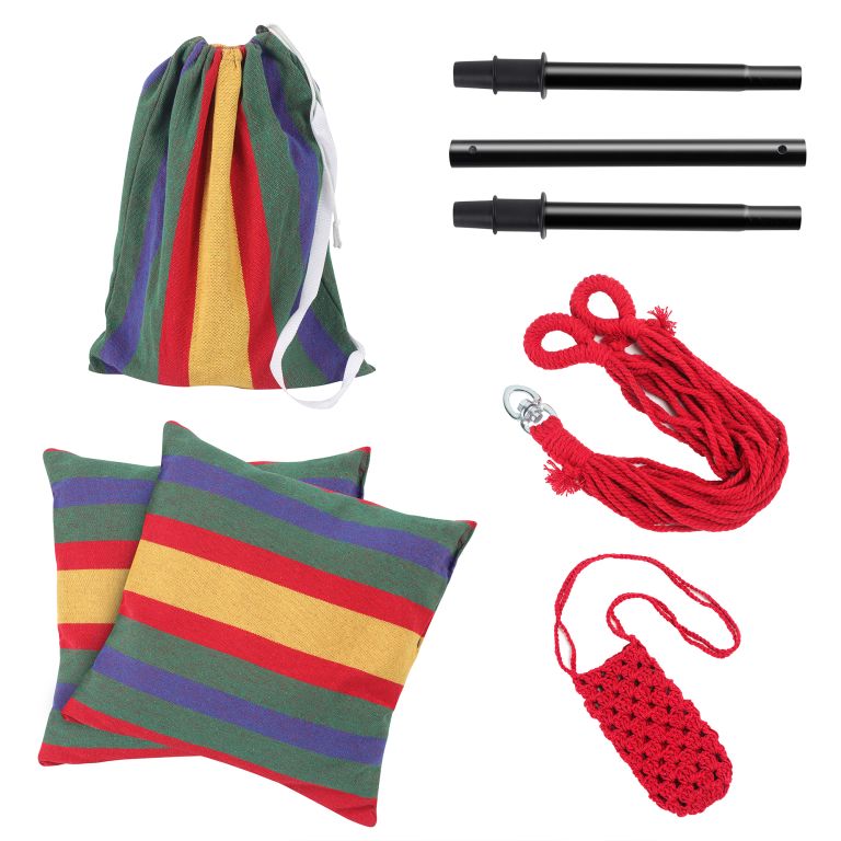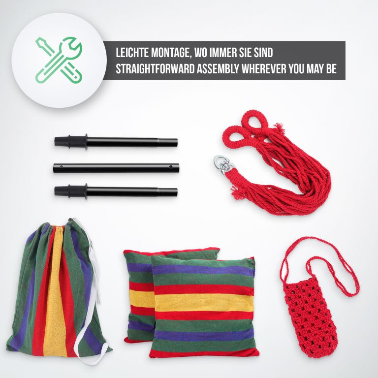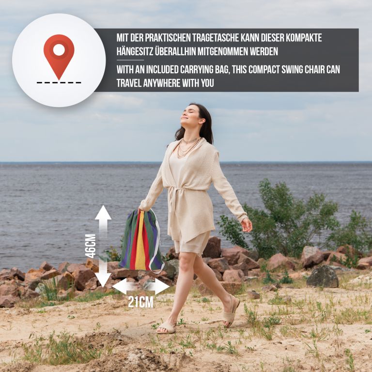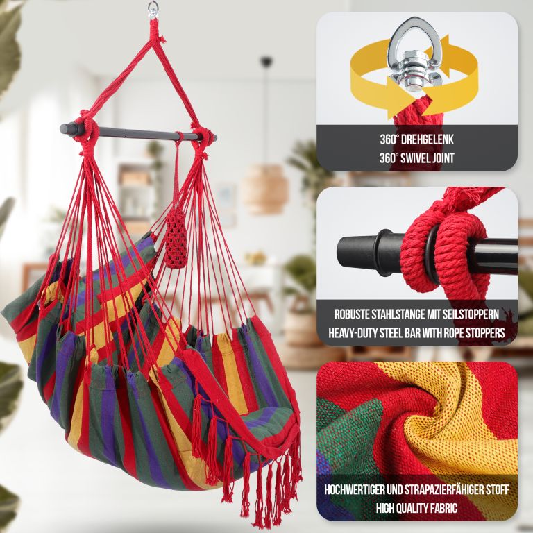 Ten wiszący fotel jest wykonany z trwałej mieszanki bawełny i poliestru i ma zdejmowane poszewki na poduszki, które można łatwo prać w pralce. Konserwacja tego wiszącego fotela jest naprawdę prosta. Ten wiszący fotel jest zamocowany na stalowym drążku rozporowym, dzięki obrotowemu przegubowi 360° można łatwo znaleźć wygodną pozycję siedzącą i cieszyć się maksymalnym komfortem. Pomimo wygodnej konstrukcji, ten wiszący fotel jest wykonany z trwałego materiału, który wytrzymuje codzienne zużycie i zapewnia długą żywotność.