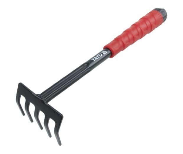 Specjalnie ukształtowany czerwony plastikowy uchwyt wygodnie trzyma się w dłoni, ułatwiając pracę w ogrodzie.
