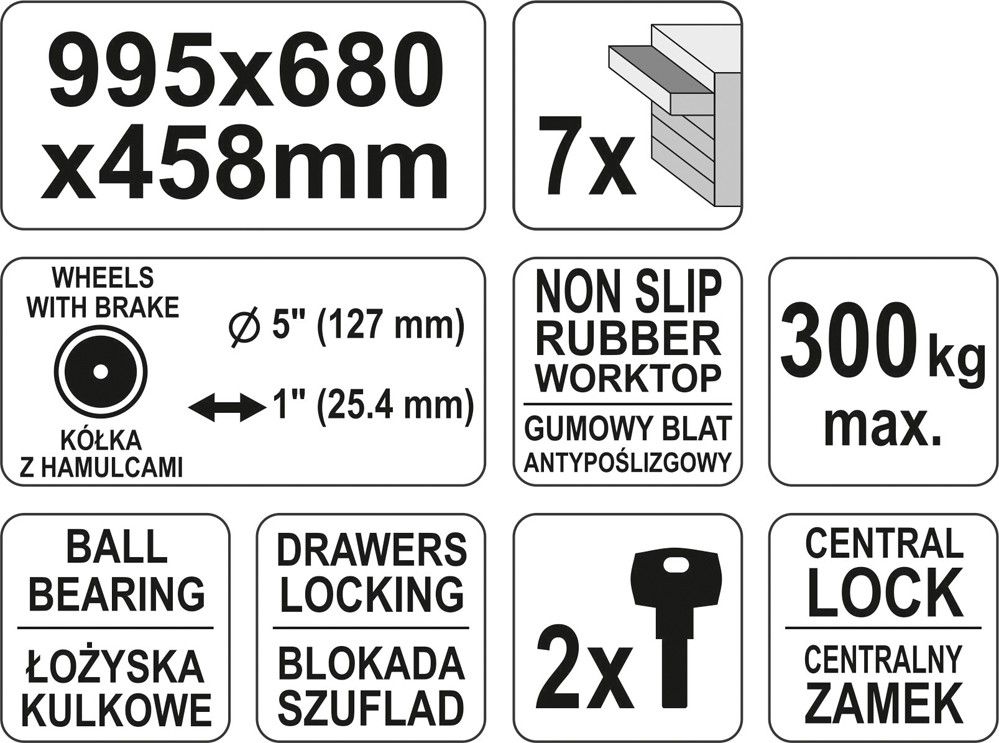 Szafka warsztatowa YATO wyposażona w 7 szuflad z łożyskami kulkowymi z centralnym ryglowaniem.