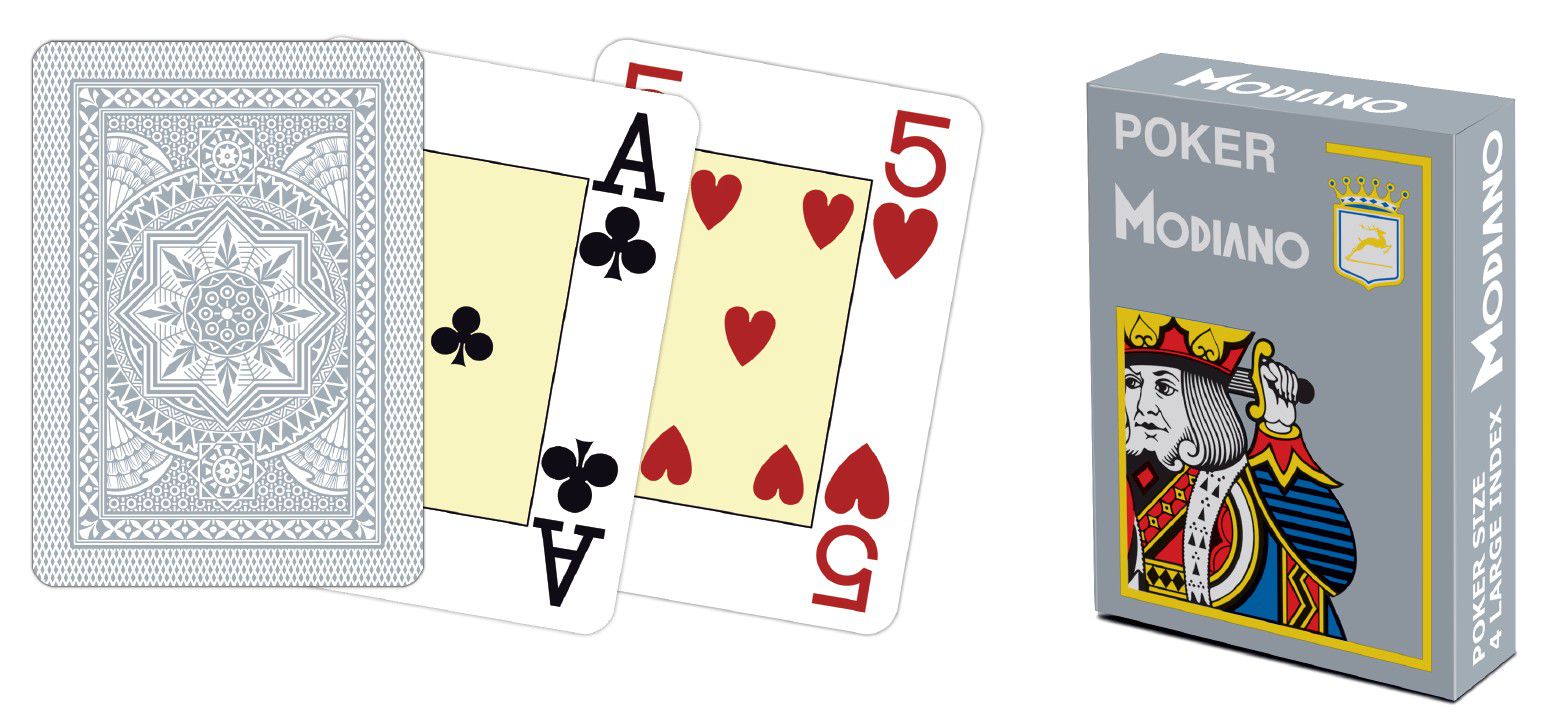 Wysokiej jakości karty pokerowe ze 100% plastiku popularnej marki Modiano. Karty Modiano są bardzo popularne wśród zwykłych graczy ze względu na ich wysoką wytrzymałość i trwałość. Dzięki 100% plastikowi karty te wytrzymują 100 razy więcej gier niż karty papierowe lub tylko plastikowe. Karty można prać, są wodoodporne i mają długą żywotność.
