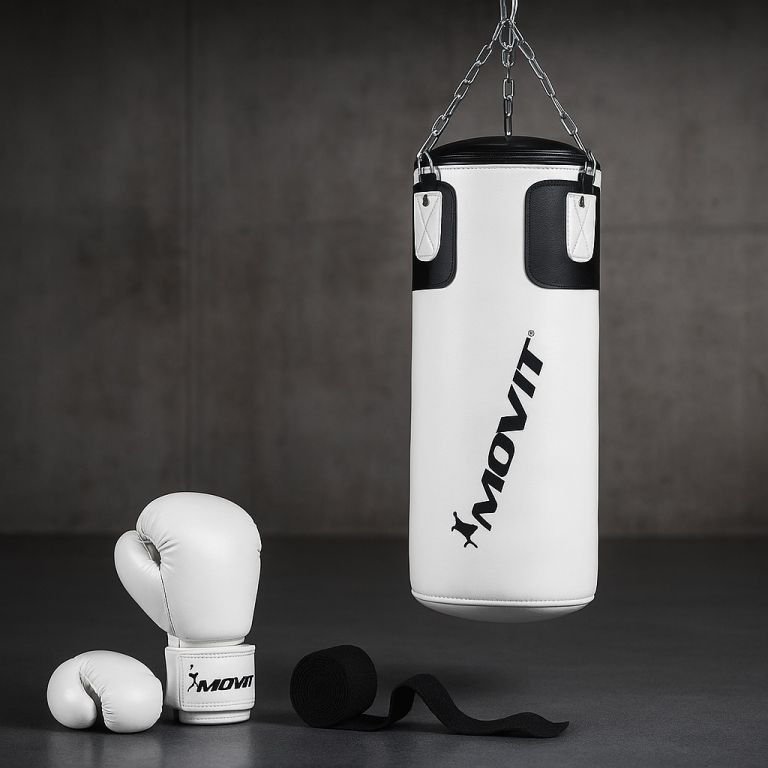 Bezpieczny i wytrzymały, stalowy łańcuch z pięciopunktowym zawieszeniem do bezpiecznego mocowania, nylonowe pętle do mocowania łańcucha dodatkowo zabezpieczone nitami. Rękawice bokserskie posiadają mocowanie kciuka, są wyściełane pianką oraz wyposażone w otwory na powietrze i rzepy.