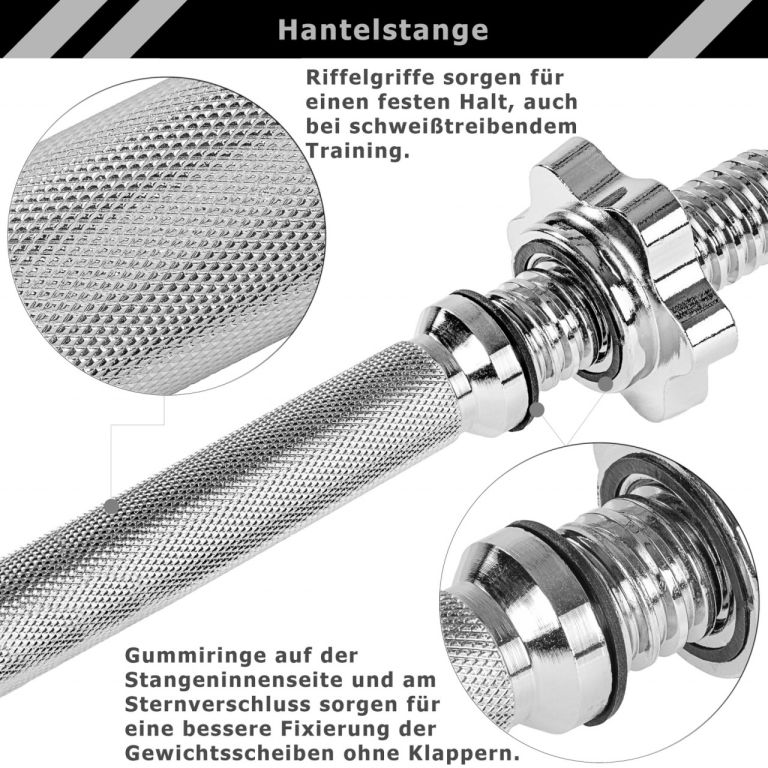 Dzięki temu zestawowi można w prosty sposób ułożyć plan treningowy dla efektywnego treningu całego ciała. Jest również kompaktowy i łatwy do przenoszenia, dzięki czemu idealnie nadaje się do podróży lub domu. Ergonomiczny kształt do treningu delikatny dla łokci i nadgarstków, antypoślizgowe uchwyty z radełkami krzyżowymi zapewniają pewny chwyt nawet podczas spocenia, gwiaździste zamki i sztanga wykonane z chromowanej stali, 30 mm chwyt tarczowy. Zamki gwiaździste zapewniają, że dyski obciążeniowe zawsze mocno i bezpiecznie spoczywają na sztangach.