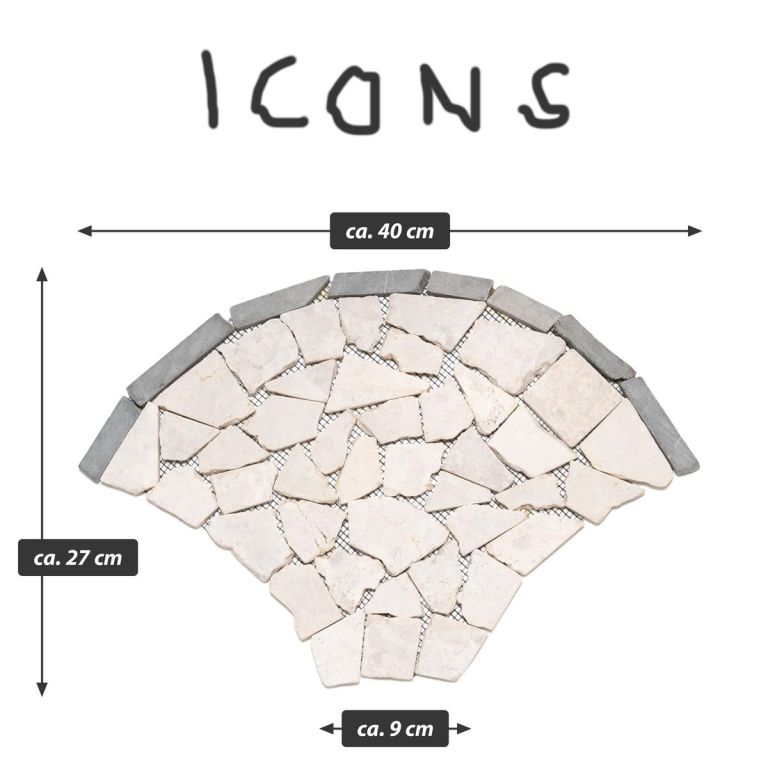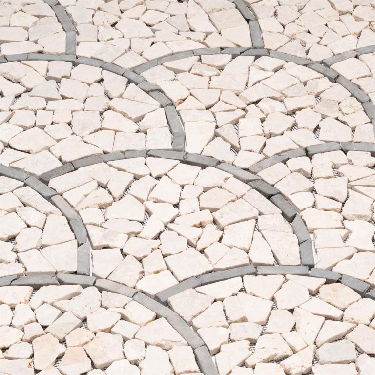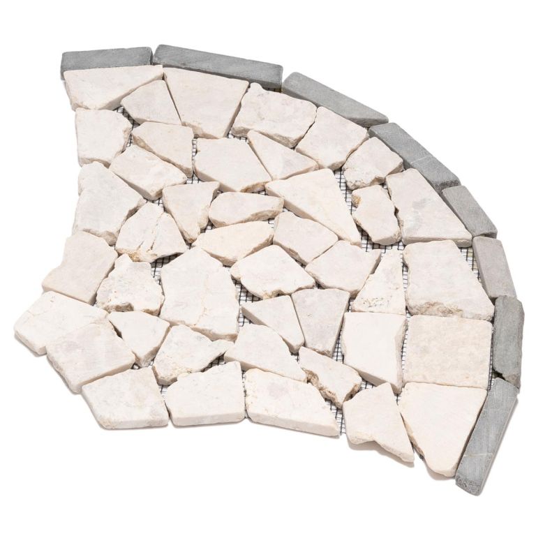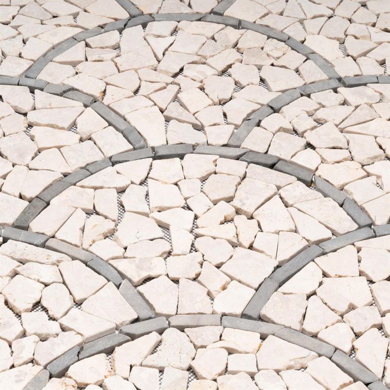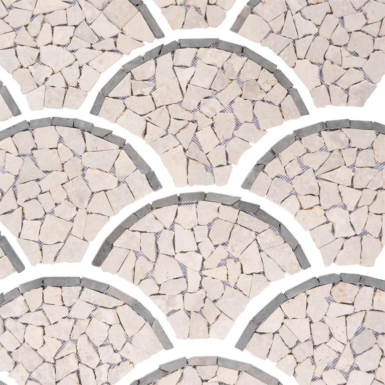 Mozaika z naturalnych kamieni w subtelnych kolorach stworzy przytulną atmosferę w Twojej łazience, kuchni, korytarzu, na tarasie lub w wejściu do domu. Twoja kreatywność nie ma ograniczeń. Eleganckie płytki z kamienia naturalnego w wzorze wachlarza lub łusek ryby tworzą wyjątkowy wygląd. Są ręcznie przyklejane do specjalnej siatki, co ułatwia instalację. Mozaika łamanka wykonana jest z polerowanych kamieni naturalnych, a krawędzie są zaokrąglone. Okrągłe, łamane kamyczki mozaikowe w kolorze kremowym są przyklejone do siatki. Przy odpowiednim przetworzeniu, mozaika z kamienia naturalnego nadaje się na okładziny lub posadzki i może być używana zarówno wewnątrz, jak i na zewnątrz.