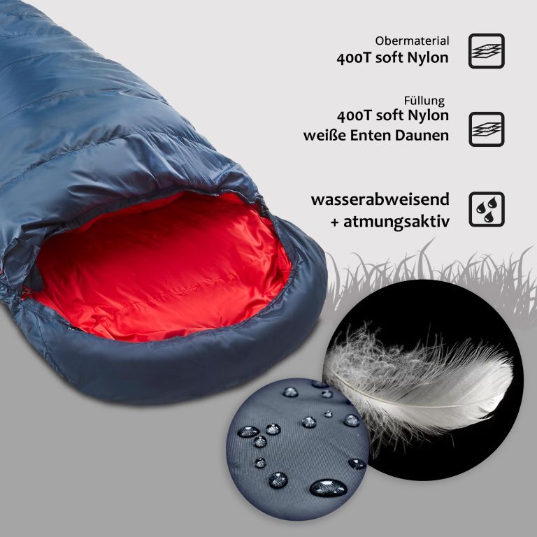 Wysokiej jakości materiały: Śpiwór został wykonany z wytrzymałego nylonu 400T wypełnionego białym kaczym pierzem. Jest wiatroszczelny, wodoodporny i odporny na rozdarcia.