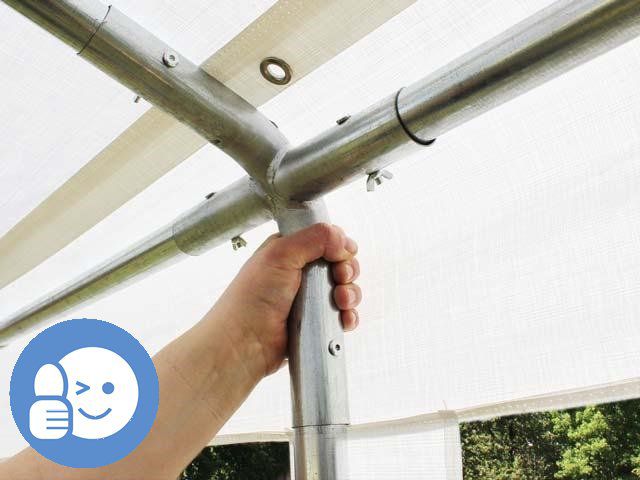 Poszycie dachu składa się z jednej części, a poszczególne panele boczne można odpiąć w pojedynczych częściach lub z całej strony - w zależności od potrzeb. Boki szczytowe lub wejściowe zabezpieczone są plandeką ze zwijanym wejściem, które można pozostawić jako solidną ścianę lub uczynić z niej przyjemne i eleganckie wejście poprzez rozwinięcie części plandeki do góry. Wejścia zabezpieczone są solidnym systemem zamków błyskawicznych. Duże panoramiczne okna na dłuższych bokach zapewniają wystarczająco dużo światła do wnętrza.