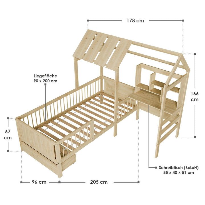 Naturalne łóżko domek z biurkiem i szufladami, 90x200 cm