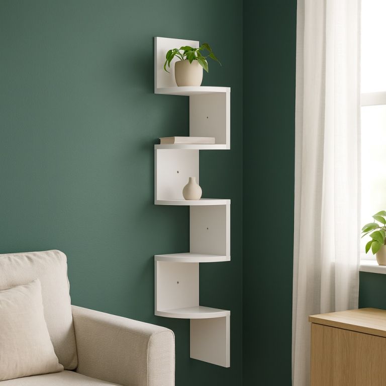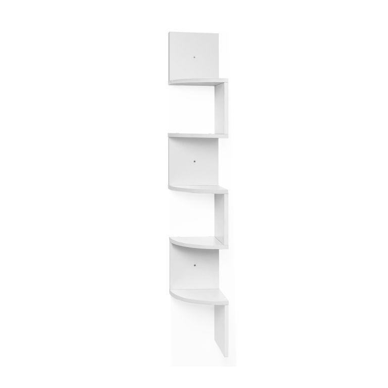 Biała półka narożna z 5 półkami, łatwa w montażu, odporna na zarysowania.