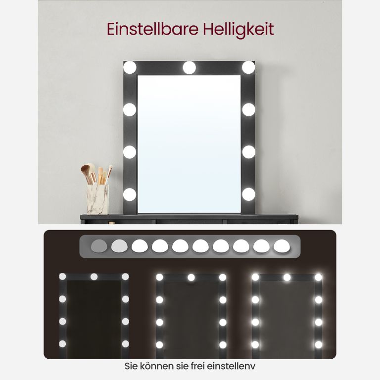 Stwórz wyjątkowe miejsce do codziennej pielęgnacji z nowoczesną toaletką LED. Regulowane światła zapewniają idealne warunki do makijażu, a pojemne schowki pomagają utrzymać porządek. Czarny kolor dodaje wnętrzu klasy i elegancji.