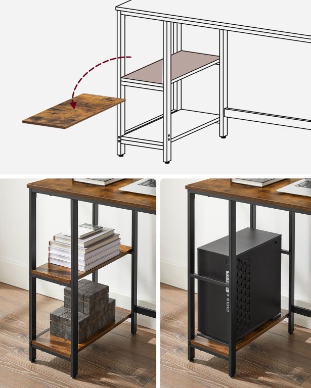 Stabilna stalowa konstrukcja i trwała płyta wiórowa gwarantują długą żywotność. Dwie boczne półki ułatwiają organizację, a górną można łatwo zdemontować. Prosty montaż z instrukcją i narzędziami w zestawie.